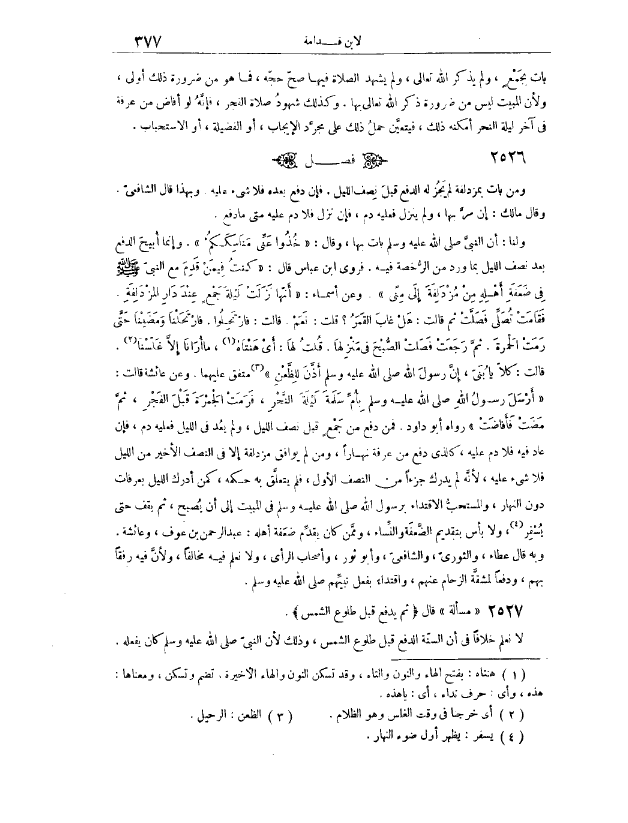(٢٥٢٧) فَصْلٌ: وَمَنْ بَاتَ بِمُزْدَلِفَةَ، لَمْ يَجُزْ لَهُ الدَّفْعُ قَبْلَ نِصْفِ اللَّيْلِ، فَإِنْ دَفَعَ بَعْدَهُ، فَلَا شَيْءَ عَلَيْهِ. وَبِهَذَا قَالَ الشَّافِعِيُّ. وَقَالَ مَالِكٌ: إنْ مَرَّ بِهَا وَلَمْ يَنْزِل، فَعَلَيْهِ دَمٌ، فَإِنْ نَزَلَ، فَلَا دَمَ عَلَيْهِ مَتَى مَا شَاءَ دَفَعَ.