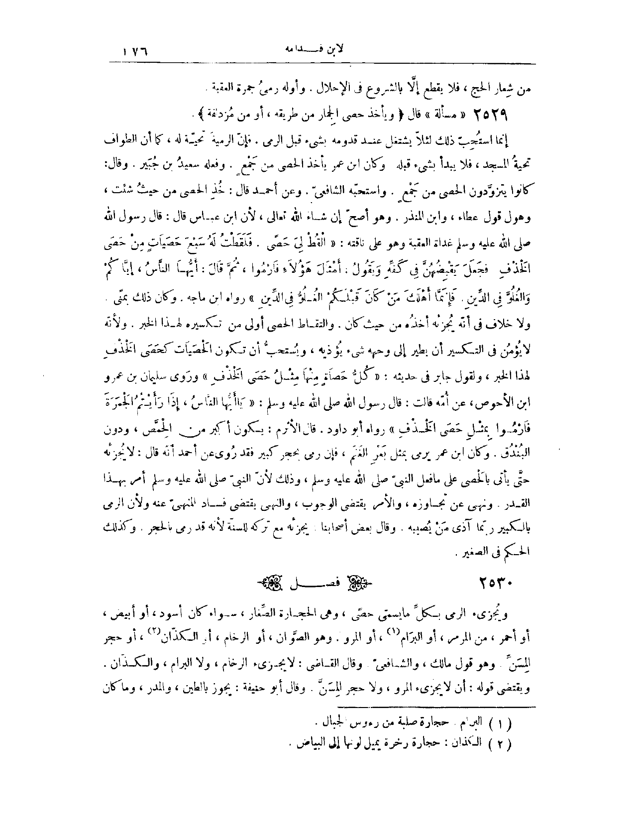 (٢٥٣١) فَصْلٌ: وَيُجْزِئُ الرَّامِيَ بِكُلِّ مَا يُسَمَّى حَصًى، وَهِيَ الْحِجَارَةُ الصِّغَارُ، سَوَاءٌ كَانَ أَسْوَدَ أَوْ أَبْيَضَ أَوْ أَحْمَرَ، مِنْ الْمَرْمَرِ، أَوْ الْبِرَامِ، أَوْ الْمَرْوِ، وَهُوَ الصَّوَّانُ، أَوْ الرُّخَامِ، أَوْ الْكَذَّانِ، أَوْ حَجَرِ الْمِسَنِّ. وَهُوَ قَوْلُ مَالِكٍ، وَالشَّافِعِيِّ.
