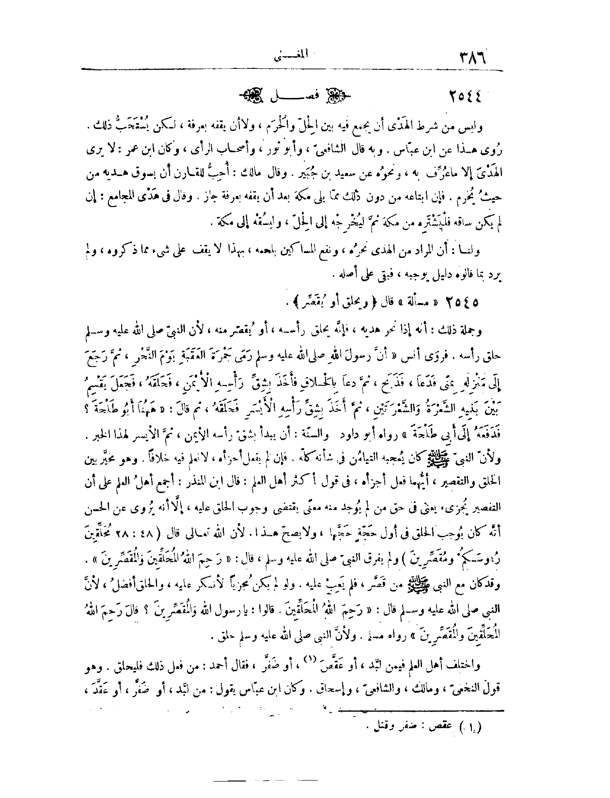 (٢٥٤٦) مَسْأَلَةٌ: قَالَ: (وَيَحْلِقُ أَوْ يُقَصِّرُ) وَجُمْلَةُ ذَلِكَ أَنَّهُ إذَا نَحَرَ هَدْيَهُ، فَإِنَّهُ يَحْلِقُ رَأْسَهُ، أَوْ يُقَصِّرُ مِنْهُ؛ لِأَنَّ النَّبِيَّ - صَلَّى اللَّهُ عَلَيْهِ وَسَلَّمَ - حَلَقَ رَأْسَهُ. فَرَوَى أَنَسٌ «أَنَّ رَسُولَ اللَّهِ - صَلَّى اللَّهُ عَلَيْهِ وَسَلَّمَ - رَمَى جَمْرَةَ الْعَقَبَةِ يَوْمَ النَّحْرِ، ثُمَّ رَجَعَ إلَى مَنْزِلِهِ بِمِنًى فَدَعَا فَذَبَحَ، ثُمَّ دَعَا بِالْحَلَّاقِ، فَأَخَذَ بِشِقِّ رَأْسِهِ الْأَيْمَنِ فَحَلَقَهُ، فَجَعَلَ يُقَسِّمُ بَيْنَ مَنْ يَلِيهِ الشَّعْرَةَ وَالشَّعْرَتَيْنِ، ثُمَّ أَخَذَ بِشِقِّ رَأْسِهِ الْأَيْسَرِ فَحَلَقَهُ، ثُمَّ قَالَ: هَاهُنَا أَبُو طَلْحَةَ؟ فَدَفَعَهُ إلَى أَبِي طَلْحَةَ.» رَوَاهُ أَبُو دَاوُد.