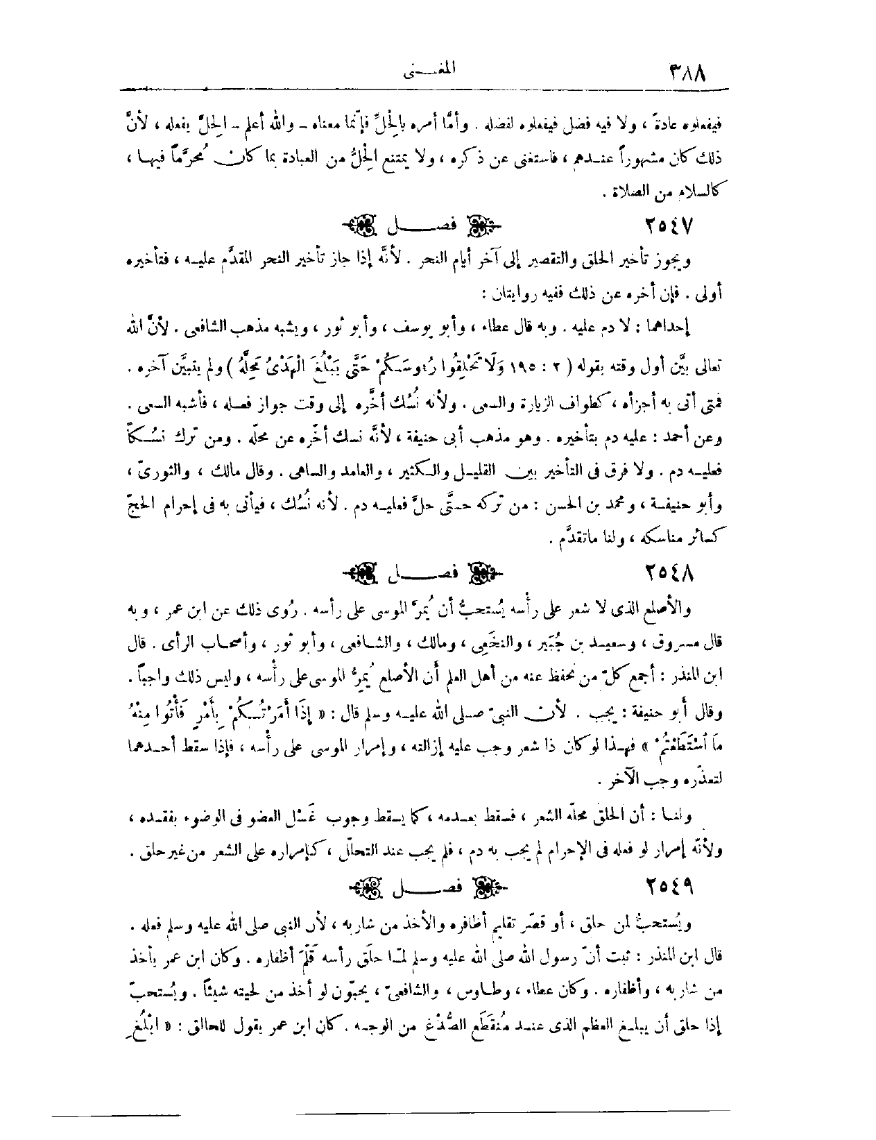 (٢٥٤٨) فَصْلٌ: وَيَجُوزُ تَأْخِيرُ الْحَلْقِ وَالتَّقْصِيرِ إلَى آخِرِ النَّحْرِ؛ لِأَنَّهُ إذَا جَازَ تَأْخِيرُ النَّحْرِ الْمُقَدَّمِ عَلَيْهِ، فَتَأْخِيرُهُ أَوْلَى، فَإِنْ أَخَّرَهُ عَنْ ذَلِكَ، فَفِيهِ رِوَايَتَانِ: إحْدَاهُمَا، لَا دَمَ عَلَيْهِ. وَبِهِ قَالَ عَطَاءٌ، وَأَبُو يُوسُفَ، وَأَبُو ثَوْرٍ. وَيُشْبِهُ مَذْهَبَ الشَّافِعِيِّ؛ لِأَنَّ اللَّهَ تَعَالَى بَيَّنَ أَوَّلَ وَقْتِهِ بِقَوْلِهِ: {وَلا تَحْلِقُوا رُءُوسَكُمْ حَتَّى يَبْلُغَ الْهَدْيُ مَحِلَّهُ} [البقرة: ١٩٦] . وَلَمْ يَتَبَيَّنْ آخِرَهُ، فَمَتَى أَتَى بِهِ أَجْزَأَهُ، كَطَوَافِ الزِّيَارَةِ وَالسَّعْيِ. وَلِأَنَّهُ نُسُكٌ أَخَّرَهُ إلَى وَقْتِ جَوَازِ فِعْلِهِ، فَأَشْبَهَ السَّعْيَ. وَعَنْ أَحْمَدَ: عَلَيْهِ دَمٌ بِتَأْخِيرِهِ.