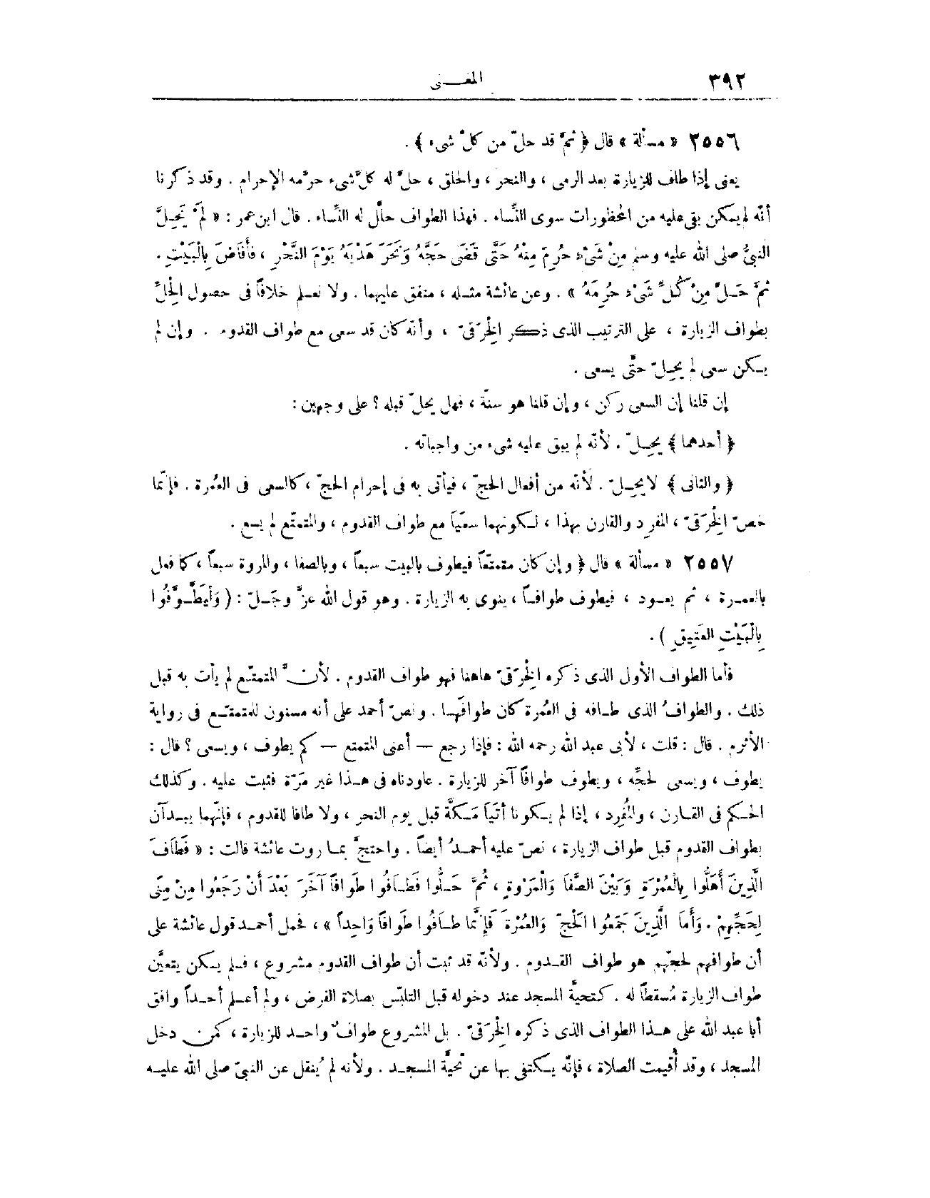 (٢٥٥٧) مَسْأَلَة: قَالَ: (ثُمَّ قَدْ حَلَّ مِنْ كُلِّ شَيْءٍ) يَعْنِي إذَا طَافَ لِلزِّيَارَةِ بَعْدَ الرَّمْيِ وَالنَّحْرِ وَالْحَلْقِ، حَلَّ لَهُ كُلُّ شَيْءٍ حَرَّمَهُ الْإِحْرَامُ. وَقَدْ ذَكَرْنَا أَنَّهُ لَمْ يَكُنْ بَقِيَ عَلَيْهِ مِنْ الْمَحْظُورَاتِ سِوَى النِّسَاءِ، فَهَذَا الطَّوَافُ حَلَّلَ لَهُ النِّسَاءَ. قَالَ ابْنُ عُمَرَ: «لَمْ يَحِلَّ النَّبِيُّ - صَلَّى اللَّهُ عَلَيْهِ وَسَلَّمَ - مِنْ شَيْءٍ حَرُمَ مِنْهُ، حَتَّى قَضَى حَجَّهُ، وَنَحَرَ هَدْيَهُ يَوْمَ النَّحْر، فَأَفَاضَ بِالْبَيْتِ، ثُمَّ حَلَّ مِنْ كُلِّ شَيْءٍ حَرَّمَهُ» .