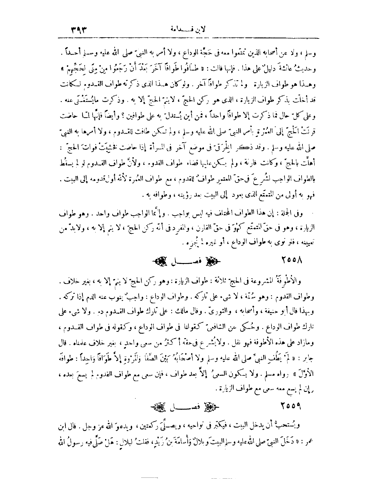 ، وَلَا عَنْ أَصْحَابِهِ الَّذِينَ تَمَتَّعُوا مَعَهُ فِي حَجَّةِ الْوَدَاعِ، وَلَا أَمَرَ بِهِ النَّبِيُّ - صَلَّى اللَّهُ عَلَيْهِ وَسَلَّمَ - أَحَدًا، وَحَدِيثُ عَائِشَةَ دَلِيلٌ عَلَى هَذَا، فَإِنَّهَا قَالَتْ: طَافُوا طَوَافًا آخَرَ بَعْدَ أَنْ رَجَعُوا مِنْ مِنًى لِحَجِّهِمْ. وَهَذَا هُوَ طَوَافُ الزِّيَارَةِ، وَلَمْ تَذْكُرْ طَوَافًا آخَرَ، وَلَوْ كَانَ هَذَا الَّذِي ذَكَرَتْهُ طَوَافَ الْقُدُومِ، لَكَانَتْ قَدْ أَخَلَّتْ بِذِكْرِ طَوَافِ الزِّيَارَةِ، الَّذِي هُوَ رُكْنُ الْحَجِّ، لَا يَتِمُّ الْحَجُّ إلَّا بِهِ، وَذَكَرَتْ مَا يُسْتَغْنَى عَنْهُ، وَعَلَى كُلِّ حَالٍ فَمَا ذَكَرَتْ إلَّا طَوَافًا وَاحِدًا، فَمِنْ أَيْنَ يُسْتَدَلُّ بِهِ عَلَى طَوَافَيْنِ؟ وَأَيْضًا فَإِنَّهَا لَمَّا حَاضَتْ، فَقَرَنَتْ الْحَجَّ إلَى الْعُمْرَةِ، بِأَمْرِ النَّبِيِّ - صَلَّى اللَّهُ عَلَيْهِ وَسَلَّمَ - وَلَمْ تَكُنْ طَافَتْ لِلْقُدُومِ لَمْ تَطُفْ لِلْقُدُومِ، وَلَا أَمَرَهَا بِهِ النَّبِيُّ - صَلَّى اللَّهُ عَلَيْهِ وَسَلَّمَ - وَقَدْ ذَكَرَ الْخِرَقِيِّ فِي مَوْضِعٍ آخَرَ، فِي الْمَرْأَةِ إذَا حَاضَتْ فَخَشِيَتْ فَوَاتَ الْحَجِّ، أَهَلَّتْ بِالْحَجِّ، وَكَانَتْ قَارِنَةً، وَلَمْ يَكُنْ عَلَيْهَا قَضَاءُ طَوَافِ الْقُدُومِ. وَلِأَنَّ طَوَافَ الْقُدُومِ لَوْ لَمْ يَسْقُطْ بِالطَّوَافِ الْوَاجِبِ، لَشُرِعَ فِي حَقِّ الْمُعْتَمِرِ طَوَافٌ لِلْقُدُومِ مَعَ طَوَافِ الْعُمْرَةِ، لِأَنَّهُ أَوَّلُ قُدُومِهِ إلَى الْبَيْتِ، فَهُوَ بِهِ أَوْلَى مِنْ الْمُتَمَتِّعِ، الَّذِي يَعُودُ إلَى الْبَيْتِ بَعْدَ رُؤْيَتِهِ وَطَوَافِهِ بِهِ، وَفِي الْجُمْلَةِ إنَّ هَذَا الطَّوَافَ الْمُخْتَلَفَ فِيهِ لَيْسَ بِوَاجِبٍ، وَإِنَّمَا الْوَاجِبُ طَوَافٌ وَاحِدٌ، وَهُوَ طَوَافُ الزِّيَارَةِ، وَهُوَ فِي حَقِّ الْمُتَمَتِّع كَهُوَ فِي حَقِّ الْقَارِنِ وَالْمُفْرِدِ، فِي أَنَّهُ رُكْنُ الْحَجِّ، لَا يَتِمُّ إلَّا بِهِ، وَلَا بُدَّ مِنْ تَعْيِينِهِ بِالنِّيَّةِ، فَلَوْ نَوَى بِهِ طَوَافَ الْوَدَاعِ أَوْ غَيْرَهُ، لَمْ يُجْزِهِ.