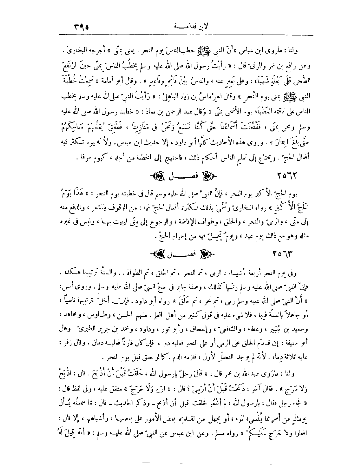 (٢٥٦٤) فَصْلٌ: وَفِي يَوْمِ النَّحْرِ أَرْبَعَةُ أَشْيَاءَ: الرَّمْيُ، ثُمَّ النَّحْرُ، ثُمَّ الْحَلْقُ، ثُمَّ الطَّوَافُ. وَالسُّنَّةُ تَرْتِيبهَا هَكَذَا؛ فَإِنَّ النَّبِيَّ - صَلَّى اللَّهُ عَلَيْهِ وَسَلَّمَ - رَتَّبَهَا، كَذَلِكَ وَصَفَهُ جَابِرٌ فِي حَجِّ النَّبِيِّ - صَلَّى اللَّهُ عَلَيْهِ وَسَلَّمَ -. وَرَوَى أَنَسٌ، أَنَّ «النَّبِيَّ - صَلَّى اللَّهُ عَلَيْهِ وَسَلَّمَ - رَمَى، ثُمَّ نَحَرَ، ثُمَّ حَلَقَ» . رَوَاهُ أَبُو دَاوُد.