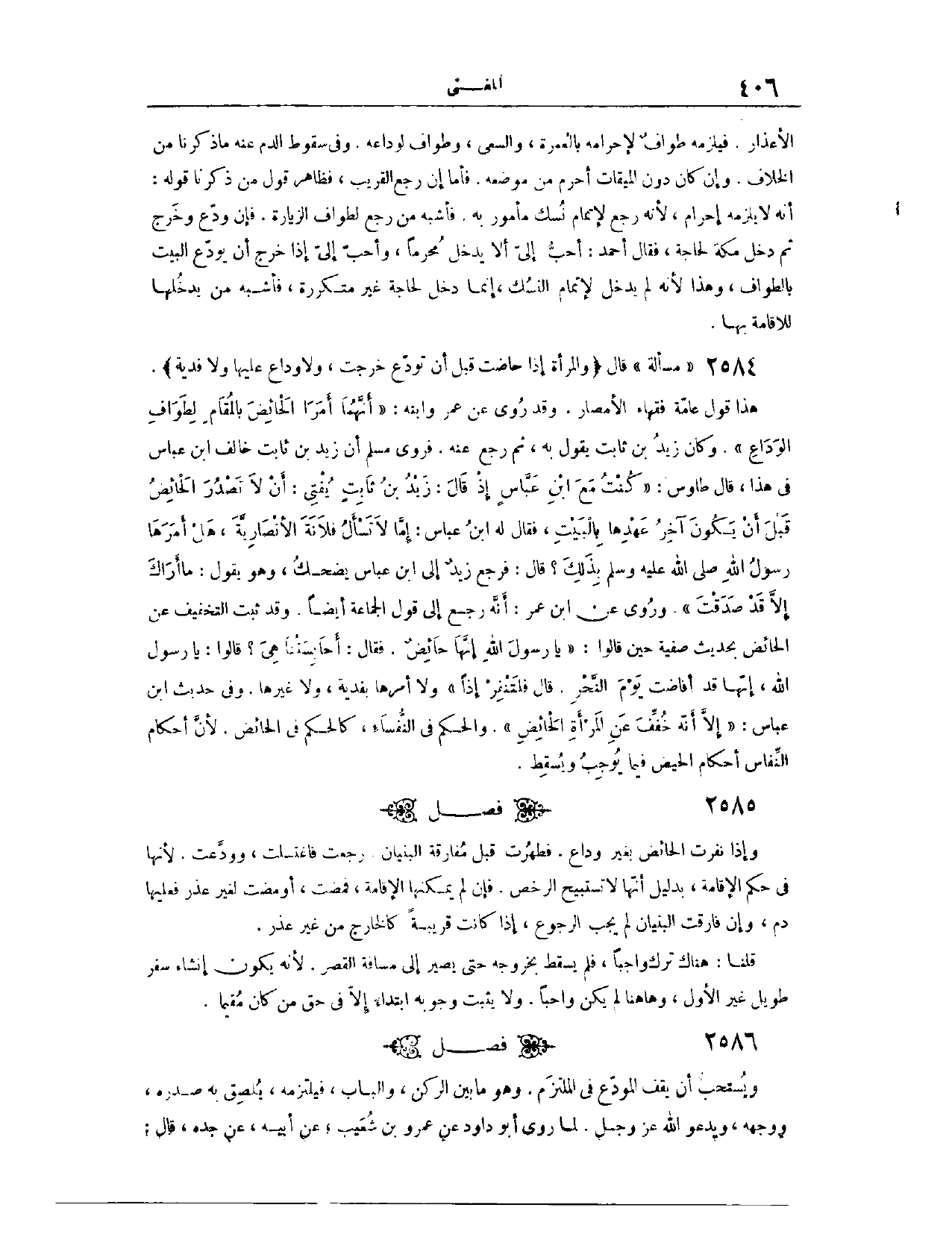 (٢٥٨٥) مَسْأَلَةٌ: قَالَ: (وَالْمَرْأَةُ إذَا حَاضَتْ قَبْلَ أَنْ تُوَدِّعَ، خَرَجَتْ، وَلَا وَدَاعَ عَلَيْهَا، وَلَا فِدْيَةَ) هَذَا قَوْلُ عَامَّةِ فُقَهَاءِ الْأَمْصَارِ. وَقَدْ رُوِيَ عَنْ عُمَرَ وَابْنِهِ أَنَّهُمَا أَمَرَا الْحَائِضَ بِالْمُقَامِ لِطَوَافِ الْوَدَاعِ، وَكَانَ زَيْدُ بْنُ ثَابِتٍ يَقُولُ بِهِ، ثُمَّ رَجَعَ عَنْهُ، فَرَوَى مُسْلِمٌ، أَنَّ زِيدَ بْنَ ثَابِتٍ خَالَفَ ابْنَ عَبَّاسٍ فِي هَذَا، قَالَ طَاوُسٌ: كُنْت مَعَ ابْنِ عَبَّاسٍ إذْ قَالَ زَيْدُ بْنُ ثَابِتٍ: تُفْتِي أَنْ لَا تَصْدُرَ الْحَائِضُ قَبْلَ أَنْ يَكُونَ آخِرُ عَهْدِهَا بِالْبَيْتِ، فَقَالَ لَهُ ابْنُ عَبَّاسٍ: إمَّا تَسْأَلُ فُلَانَةَ الْأَنْصَارِيَّةَ، هَلْ أَمَرَهَا رَسُولُ اللَّهِ - صَلَّى اللَّهُ عَلَيْهِ وَسَلَّمَ - بِذَلِكَ؟ قَالَ: فَرَجَعَ زَيْدٌ إلَى ابْنِ عَبَّاسٍ يَضْحَكُ، وَهُوَ يَقُولُ: مَا أَرَاك إلَّا قَدْ صَدَقْت.