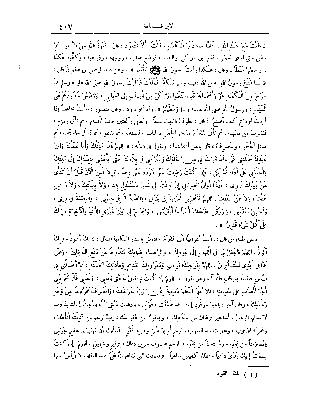 طُفْت مَعَ عَبْدِ اللَّهِ، فَلَمَّا جَاءَ دُبُرَ الْكَعْبَةِ، قُلْت: أَلَا تَتَعَوَّذُ؟ قَالَ: نَعُوذُ بِاَللَّهِ مِنْ النَّارِ. ثُمَّ مَضَى حَتَّى اسْتَلَمَ الْحَجَرَ، فَقَامَ بَيْنَ الرُّكْنِ وَالْبَابِ، فَوَضَعَ صَدْرَهُ وَوَجْهَهُ وَذِرَاعَيْهِ وَكَفَّيْهِ هَكَذَا - وَبَسَطَهَا بَسْطًا - وَقَالَ: هَكَذَا رَأَيْت رَسُولَ اللَّه - صَلَّى اللَّهُ عَلَيْهِ وَسَلَّمَ - يَفْعَلُهُ. وَعَنْ عَبْدِ الرَّحْمَنِ بْنِ صَفْوَانَ، قَالَ: لَمَّا فَتَحَ رَسُولُ اللَّهِ - صَلَّى اللَّهُ عَلَيْهِ وَسَلَّمَ - مَكَّةَ، انْطَلَقْت فَرَأَيْت رَسُولَ اللَّهِ - صَلَّى اللَّهُ عَلَيْهِ وَسَلَّمَ - قَدْ خَرَجَ مِنْ الْكَعْبَةِ، هُوَ وَأَصْحَابُهُ، قَدْ اسْتَلَمُوا الرُّكْنَ مِنْ الْبَابِ إلَى الْحَطِيمِ، وَوَضَعُوا خُدُودَهُمْ عَلَى الْبَيْتِ، وَرَسُولُ اللَّهِ - صَلَّى اللَّهُ عَلَيْهِ وَسَلَّمَ - وَسَطَهُمْ. رَوَاهُ أَبُو دَاوُد. وَقَالَ مَنْصُورٌ: سَأَلْت مُجَاهِدًا: إذَا أَرَدْت الْوَدَاعَ، كَيْفَ أَصْنَعُ؟ قَالَ: تَطُوفُ بِالْبَيْتِ سَبْعًا، وَتُصَلِّي رَكْعَتَيْنِ خَلْفَ الْمَقَامِ، ثُمَّ تَأْتِي زَمْزَمَ فَتَشْرَبُ مِنْ مَائِهَا، ثُمَّ تَأْتِي الْمُلْتَزَمَ مَا بَيْنَ الْحَجَرِ وَالْبَابِ، فَتَسْتَلِمُهُ، ثُمَّ تَدْعُو، ثُمَّ تَسْأَلُ حَاجَتَك، ثُمَّ تَسْتَلِمُ الْحَجَرَ، وَتَنْصَرِفُ.
