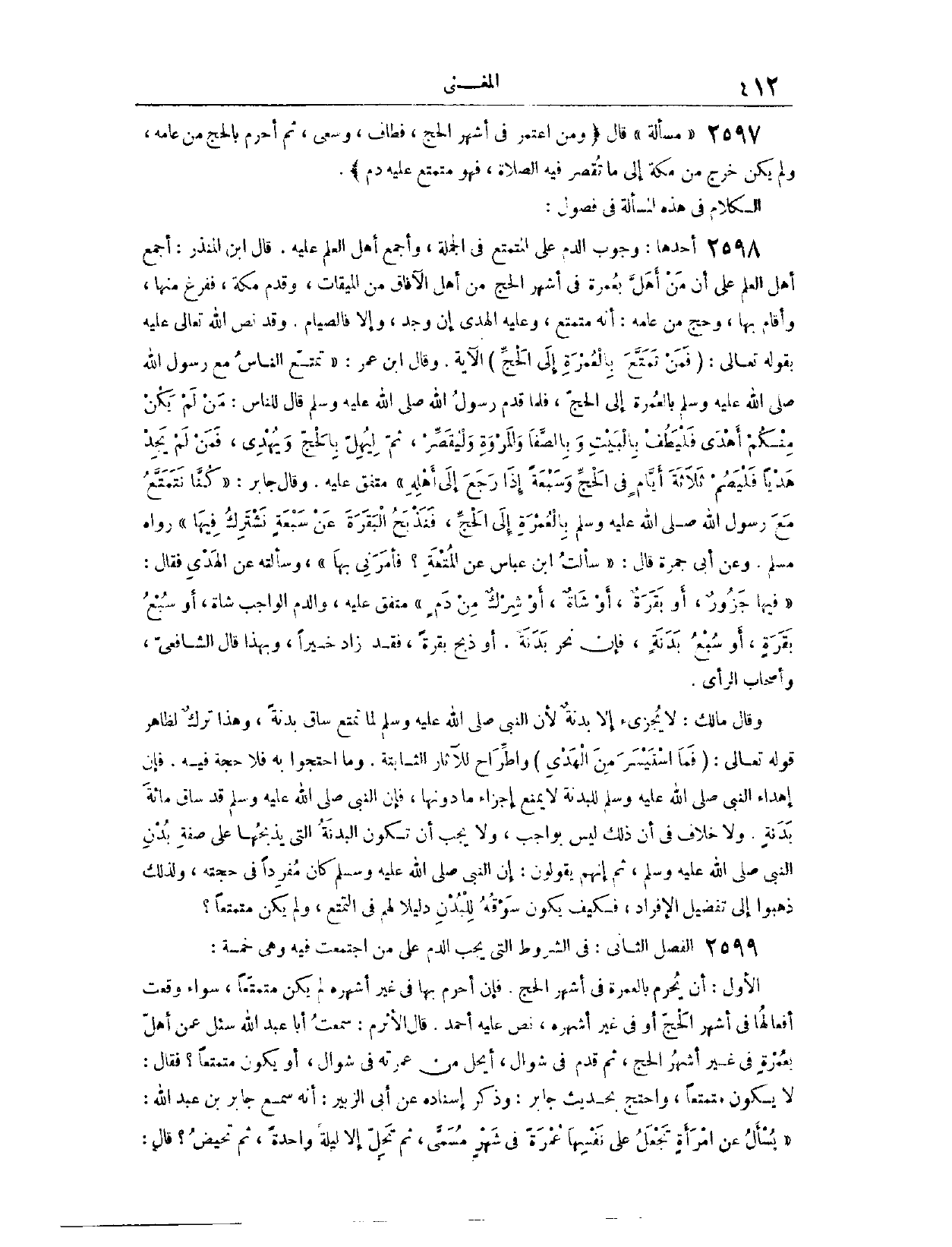(٢٥٩٨) مَسْأَلَةٌ: قَالَ: (وَمَنْ اعْتَمَرَ فِي أَشْهُرِ الْحَجِّ، فَطَافَ وَسَعَى، ثُمَّ أَحْرَمَ بِالْحَجِّ مِنْ عَامِهِ، وَلَمْ يَكُنْ خَرَجَ مِنْ مَكَّةَ إلَى مَا تُقْصَرُ فِيهِ الصَّلَاةُ، فَهُوَ مُتَمَتِّعٌ، عَلَيْهِ دَمٌ) (٢٥٩٩) فَصْلٌ: الْكَلَامُ فِي هَذِهِ الْمَسْأَلَةِ فِي فُصُولٍ: أَحَدُهَا، وُجُوبُ الدَّمِ عَلَى الْمُتَمَتِّعِ فِي الْجُمْلَةِ. وَأَجْمَعَ أَهْلُ الْعِلْمِ عَلَيْهِ.