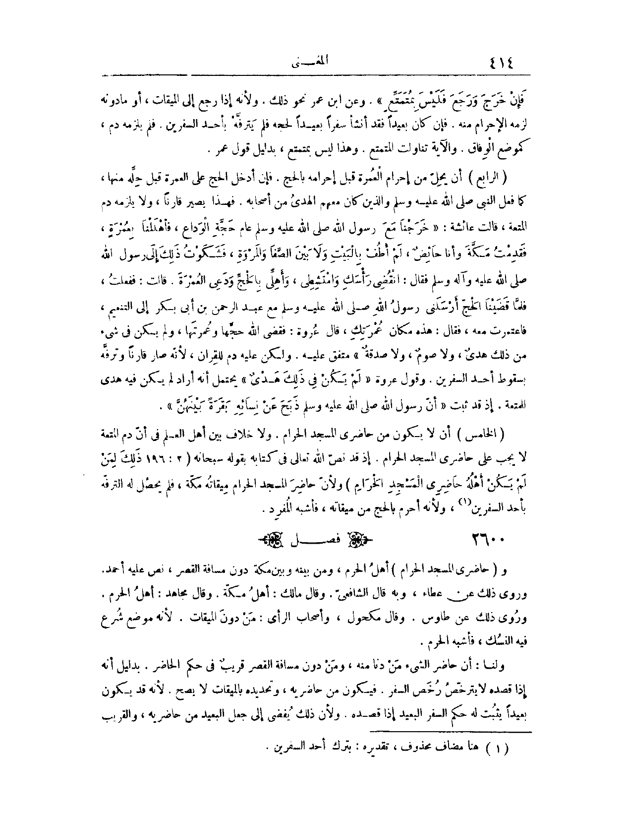 وَقَوْلُ عُرْوَةَ: لَمْ يَكُنْ فِي ذَلِكَ هَدْيٌ. يَحْتَمِلُ أَنَّهُ أَرَادَ لَمْ يَكُنْ فِيهِ هَدْيٌ لِلْمُتْعَةِ، إذْ قَدْ ثَبَتَ أَنَّ رَسُولَ اللَّهِ - صَلَّى اللَّهُ عَلَيْهِ وَسَلَّمَ - ذَبَحَ عَنْ نِسَائِهِ بَقَرَةً بَيْنَهُنَّ. الْخَامِسُ، أَنْ لَا يَكُونَ مِنْ حَاضِرِي الْمَسْجِدِ الْحَرَامِ. وَلَا خِلَافَ بَيْنَ أَهْلِ الْعِلْمِ، فِي أَنَّ دَمَ الْمُتْعَةِ لَا يَجِبُ عَلَى حَاضِرِي الْمَسْجِدِ الْحَرَامِ، إذْ قَدْ نَصَّ اللَّهُ تَعَالَى فِي كِتَابِهِ بِقَوْلِهِ سُبْحَانَهُ: {ذَلِكَ لِمَنْ لَمْ يَكُنْ أَهْلُهُ حَاضِرِي الْمَسْجِدِ الْحَرَامِ} [البقرة: ١٩٦] . وَلِأَنَّ حَاضِرَ الْمَسْجِدِ الْحَرَامِ مِيقَاتُهُ مَكَّةُ، فَلَمْ يَحْصُلْ لَهُ التَّرَفُّهُ بِأَحَدِ السَّفَرَيْنِ، وَلِأَنَّهُ أَحْرَمَ بِالْحَجِّ مِنْ مِيقَاتِهِ، فَأَشْبَهَ الْمُفْرِدَ.