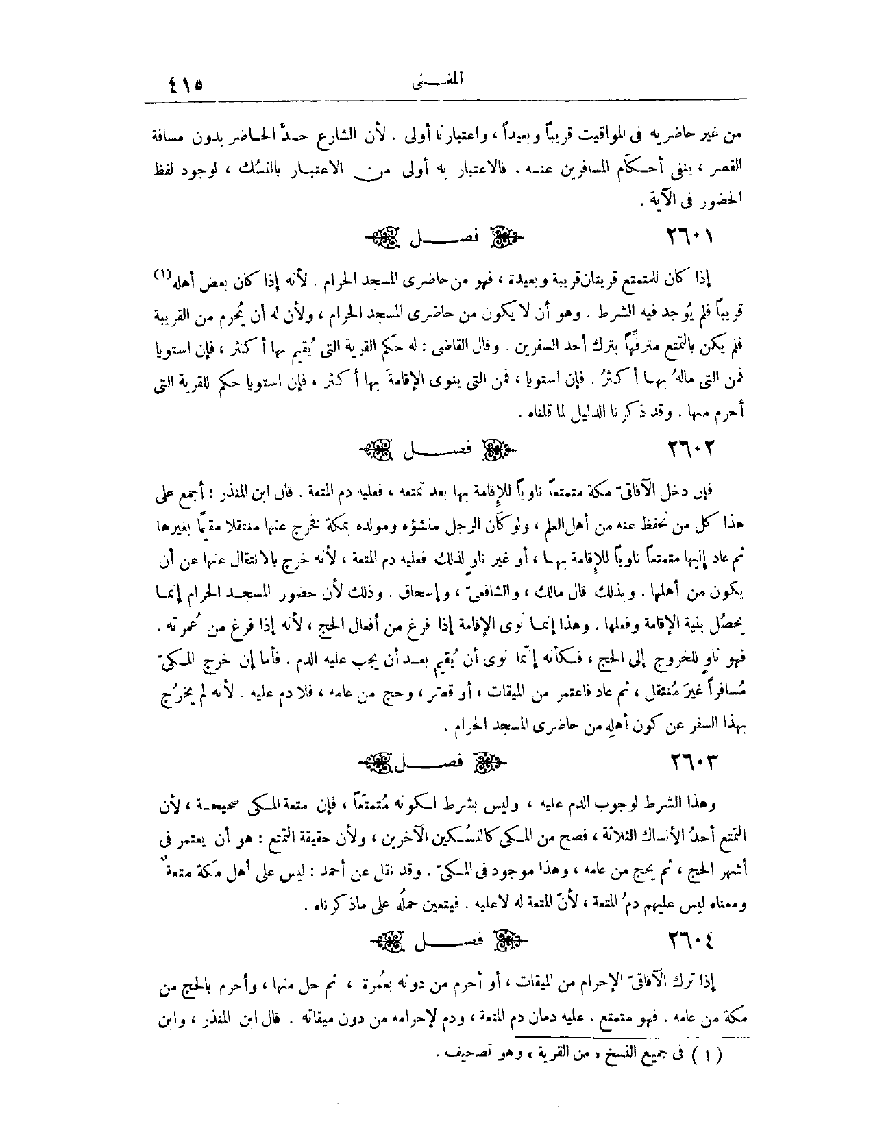 (٢٦٠٢) فَصْلٌ: إذَا كَانَ لِلْمُتَمَتِّعِ قَرْيَتَانِ؛ قَرِيبَةٌ، وَبَعِيدَةٌ، فَهُوَ مِنْ حَاضِرِي الْمَسْجِدِ الْحَرَامِ؛ لِأَنَّهُ إذَا كَانَ بَعْضُ أَهْلِهِ قَرِيبًا فَلَمْ يُوجَدْ فِيهِ الشَّرْطُ، وَهُوَ أَنْ لَا يَكُونَ مِنْ حَاضِرِي الْمَسْجِدِ الْحَرَامِ. وَلِأَنَّ لَهُ أَنْ يُحْرِمَ مِنْ الْقَرِيبَةِ، فَلَمْ يَكُنْ بِالتَّمَتُّعِ مُتَرَفِّهًا بِتَرْكِ أَحَدِ السَّفَرَيْنِ.
