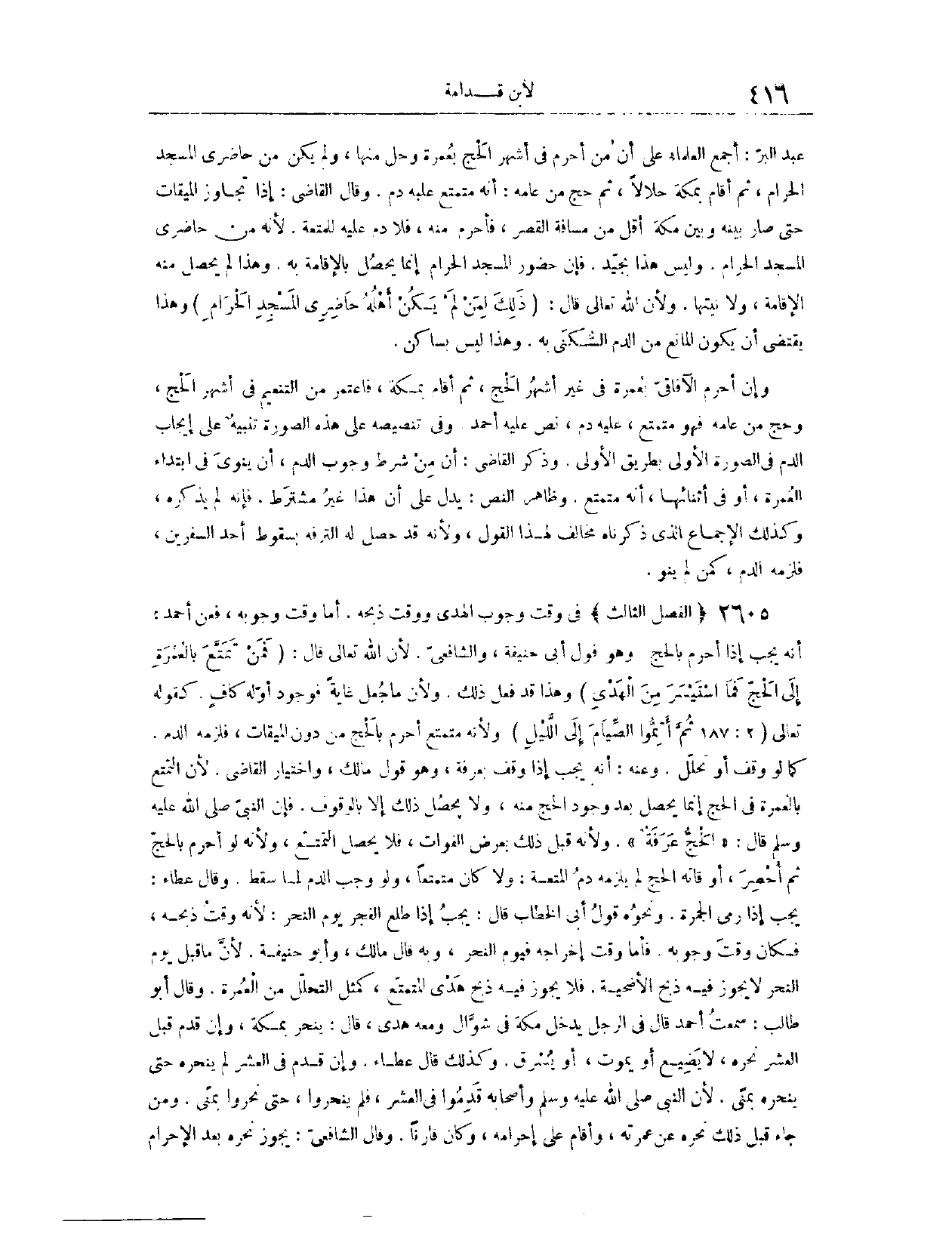 عَبْدِ الْبَرَّ: أَجْمَعَ الْعُلَمَاءُ عَلَى أَنَّ مَنْ أَحْرَمَ فِي أَشْهُرِ الْحَجِّ بِعُمْرَةٍ، وَحَلَّ مِنْهَا، وَلَمْ يَكُنْ مِنْ حَاضِرِي الْمَسْجِدِ الْحَرَامِ، ثُمَّ أَقَامَ بِمَكَّةَ حَلَالًا، ثُمَّ حَجَّ مِنْ عَامِهِ، أَنَّهُ مُتَمَتِّعٌ، عَلَيْهِ دَمٌ.