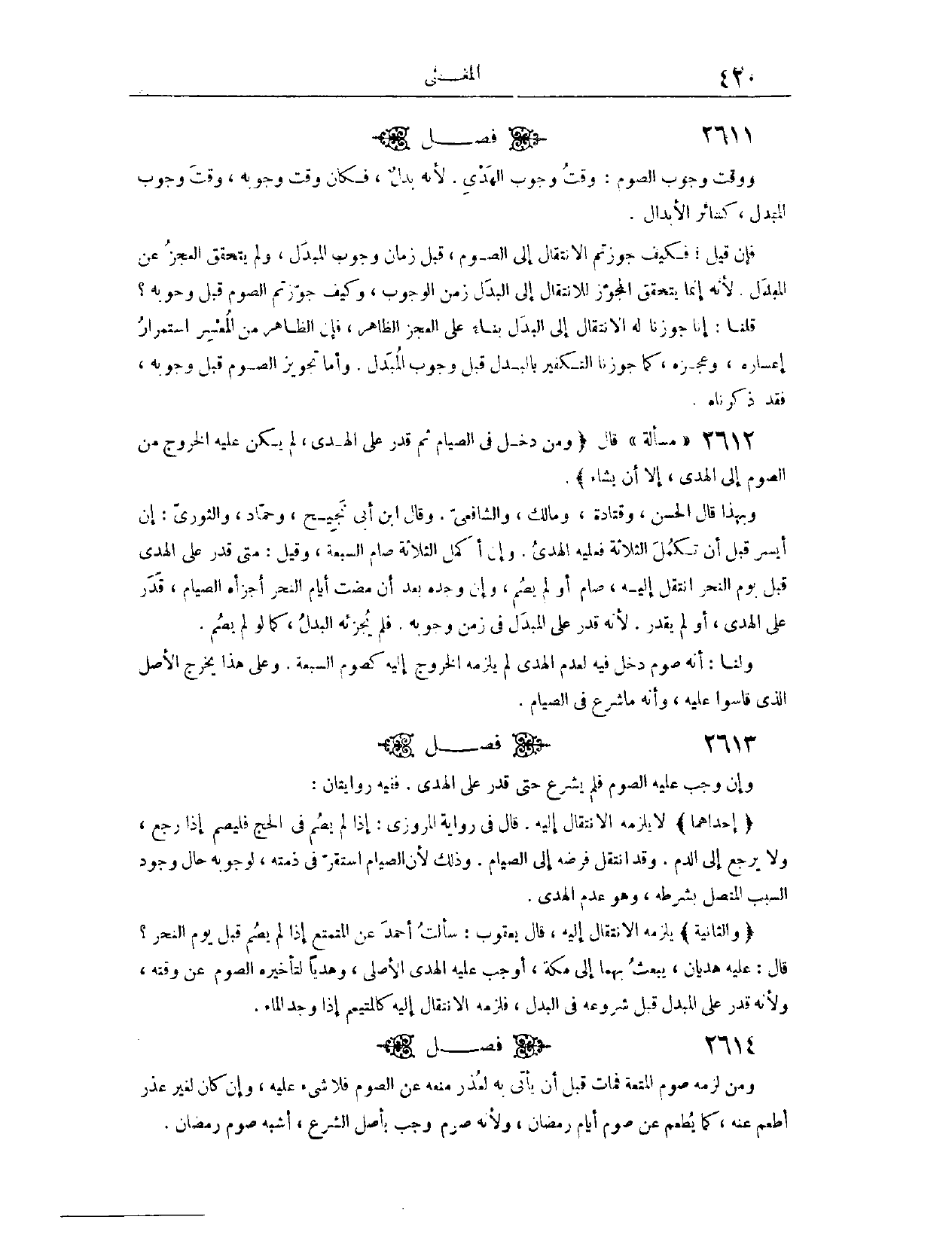 (٢٦١٤) فَصْلٌ: وَإِنْ وَجَبَ عَلَيْهِ الصَّوْمُ، فَلَمْ يَشْرَعْ حَتَّى قَدَرَ عَلَى الْهَدْيِ، فَفِيهِ رِوَايَتَانِ: إحْدَاهُمَا، لَا يَلْزَمُهُ الِانْتِقَالُ إلَيْهِ. قَالَ فِي رِوَايَةِ الْمَرُّوذِيِّ: إذَا لَمْ يَصُمْ فِي الْحَجِّ فَلْيَصُمْ إذَا رَجَعَ. وَلَا يَرْجِعُ إلَى الدَّمِ، وَقَدْ انْتَقَلَ فَرْضُهُ إلَى الصِّيَامِ؛ وَذَلِكَ لِأَنَّ الصِّيَامَ اسْتَقَرَّ فِي ذِمَّتِهِ، لِوُجُوبِهِ حَالَ وُجُودِ السَّبَبِ الْمُتَّصِلِ بِشَرْطِهِ، وَهُوَ عَدَمُ الْهَدْيِ. وَالثَّانِيَةُ، يَلْزَمُهُ الِانْتِقَالُ إلَيْهِ. قَالَ يَعْقُوبُ: سَأَلْت أَحْمَدَ عَنْ الْمُتَمَتِّعِ إذَا لَمْ يَصُمْ قَبْلَ يَوْمِ النَّحْرِ؟ قَالَ: عَلَيْهِ هَدْيَانِ، يَبْعَثُ بِهِمَا إلَى مَكَّةَ. أُوجِبُ عَلَيْهِ الْهَدْيَ الْأَصْلِيَّ، وَهَدْيًا لِتَأْخِيرِهِ الصَّوْمَ عَنْ وَقْتِهِ؛ وَلِأَنَّهُ قَدَرَ عَلَى الْمُبْدَلِ قَبْلَ شُرُوعِهِ فِي الْبَدَلِ، فَلَزِمَهُ الِانْتِقَالُ إلَيْهِ، كَالْمُتَيَمِّمِ إذَا وَجَدَ الْمَاءَ.
