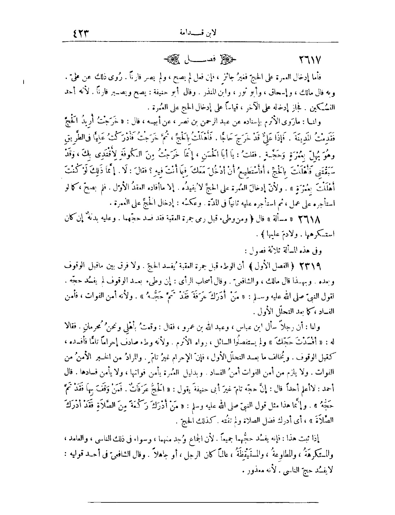 وَلَنَا، أَنَّ رَجُلًا سَأَلَ ابْنَ عَبَّاسٍ وَعَبْدَ اللَّهِ بْنَ عَمْرٍو، فَقَالَ: وَقَعْت بِأَهْلِي وَنَحْنُ مُحْرِمَانِ. فَقَالَا لَهُ: أَفْسَدْت حَجَّك. وَلَمْ يَسْتَفْصِلُوا السَّائِلَ. رَوَاهُ الْأَثْرَمُ. وَلِأَنَّهُ وَطْءٌ صَادَفَ إحْرَامًا تَامًّا فَأَفْسَدَهُ، كَقَبْلِ الْوُقُوفِ، وَيُخَالِفُ مَا بَعْدَ التَّحَلُّلِ الْأَوَّلِ، فَإِنَّ الْإِحْرَامَ غَيْرُ تَامٍّ، وَالْمُرَادُ مِنْ الْخَبَرِ الْأَمْنُ مِنْ الْفَوَاتِ، وَلَا يَلْزَمُ مِنْ أَمْنِ الْفَوَاتِ أَمْنُ الْفَسَادِ، وَبِدَلِيلِ الْعُمْرَةِ يَأْمَنُ فَوَاتَهَا وَلَا يَأْمَنُ فَسَادَهَا. قَالَ أَحْمَدُ: لَا أَعْلَمُ أَحَدًا قَالَ: إنَّ حَجَّهُ تَامٌّ.