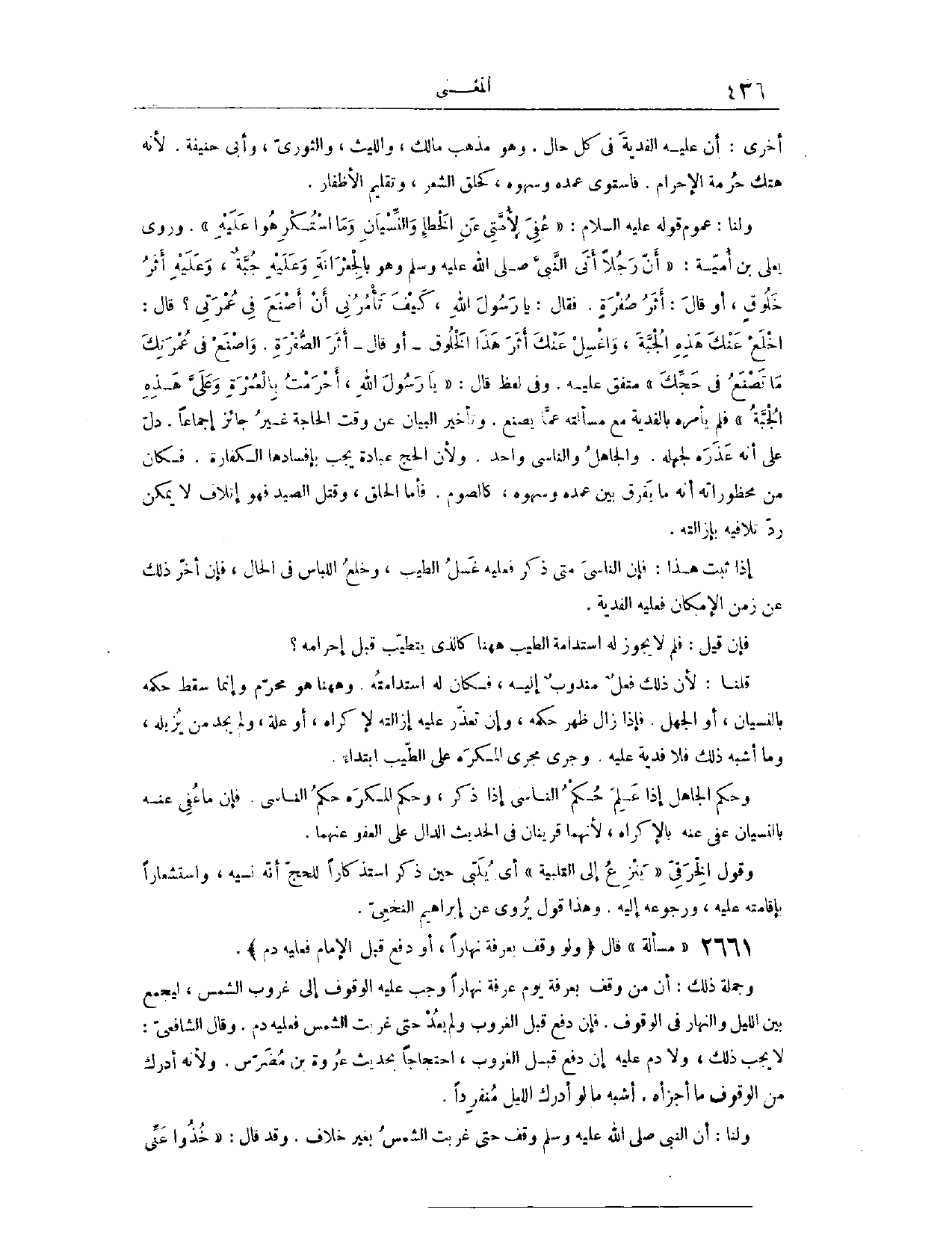 وَفِي لَفْظٍ، قَالَ: يَا رَسُولَ اللَّهِ، «أَحْرَمْت بِالْعُمْرَةِ، وَعَلَيَّ هَذِهِ الْجُبَّةُ» . فَلَمْ يَأْمُرْهُ بِالْفِدْيَةِ مَعَ مَسْأَلَتِهِ عَمَّا يَصْنَعُ، وَتَأْخِيرُ الْبَيَانِ عَنْ وَقْتِ الْحَاجَةِ غَيْرُ جَائِزٍ إجْمَاعًا، دَلَّ عَلَى أَنَّهُ عَذَرَهُ لِجَهْلِهِ، وَالْجَاهِلُ وَالنَّاسِي وَاحِدٌ، وَلِأَنَّ الْحَجَّ عِبَادَةٌ يَجِبُ بِإِفْسَادِهَا الْكَفَّارَةُ، فَكَانَ مِنْ مَحْظُورَاتِهِ أَنَّهُ مَا يُفَرَّقُ بَيْنَ عَمْدِهِ وَسَهْوِهِ، كَالصَّوْمِ، فَأَمَّا الْحَلْقُ وَقَتْلُ الصَّيْدِ، فَهُوَ إتْلَافٌ لَا يُمْكِنُ رَدُّ تَلَافِيهِ، بِإِزَالَتِهِ.