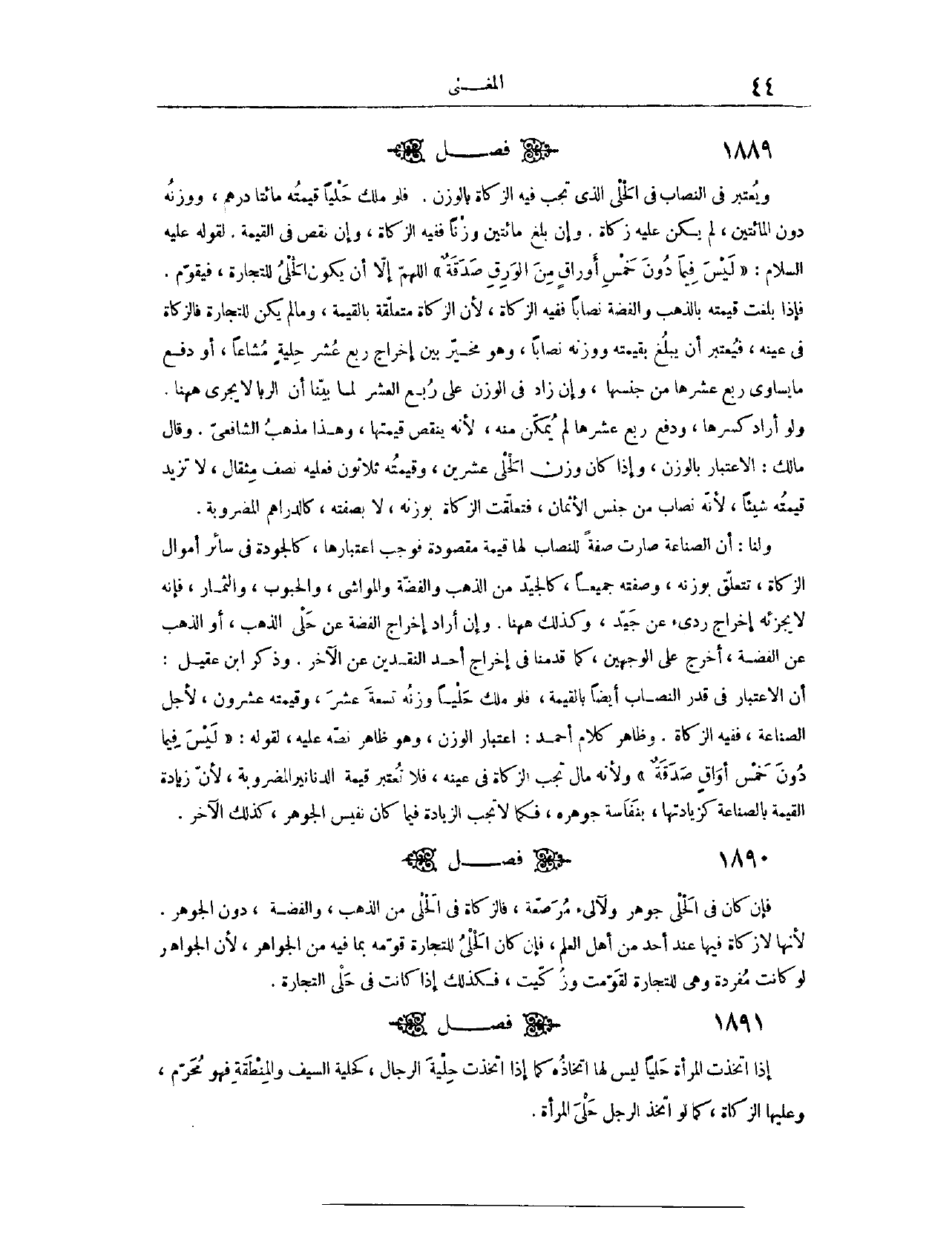 (١٨٨٩) فَصْلٌ: وَيُعْتَبَرُ فِي النِّصَابِ فِي الْحُلِيِّ الَّذِي تَجِبُ فِيهِ الزَّكَاةُ بِالْوَزْنِ، فَلَوْ مَلَكَ حُلِيًّا قِيمَتُهُ مِائَتَا دِرْهَمٍ، وَوَزْنُهُ دُونَ الْمِائَتَيْنِ، لَمْ يَكُنْ عَلَيْهِ زَكَاةٌ. وَإِنْ بَلَغَ مِائَتَيْنِ وَزْنًا، فَفِيهِ الزَّكَاةُ، وَإِنْ نَقَصَ فِي الْقِيمَةِ؛ لِقَوْلِهِ عَلَيْهِ السَّلَامُ: «لَيْسَ فِيمَا دُونَ خَمْسِ أَوَاقٍ مِنْ الْوَرِقِ صَدَقَةٌ.» .