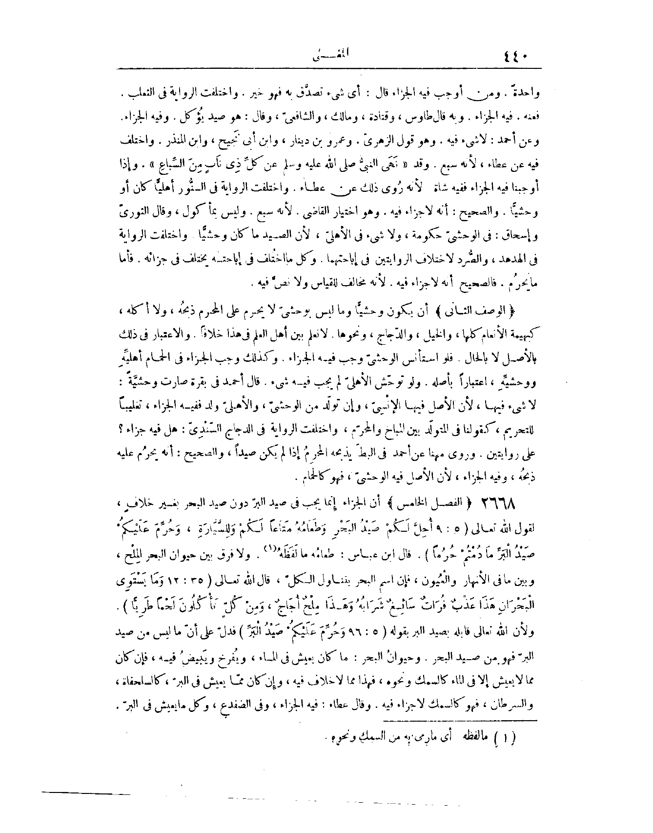 (٢٦٦٩) الْفَصْلُ الْخَامِسُ، أَنَّ الْجَزَاءَ إنَّمَا يَجِبُ فِي صَيْدِ الْبَرِّ دُونَ صَيْدِ الْبَحْرِ، بِغَيْرِ خِلَافٍ؛ لِقَوْلِ اللَّهِ تَعَالَى {أُحِلَّ لَكُمْ صَيْدُ الْبَحْرِ وَطَعَامُهُ مَتَاعًا لَكُمْ وَلِلسَّيَّارَةِ وَحُرِّمَ عَلَيْكُمْ صَيْدُ الْبَرِّ مَا دُمْتُمْ حُرُمًا} [المائدة: ٩٦] قَالَ ابْنُ عَبَّاسٍ: طَعَامُهُ مَا لَفَظَهُ. وَلَا فَرْقَ بَيْنَ حَيَوَانِ الْبَحْرِ الْمِلْحِ وَبَيْنَ مَا فِي الْأَنْهَارِ وَالْعُيُونِ، فَإِنَّ اسْمَ الْبَحْرِ يَتَنَاوَلُ الْكُلَّ، قَالَ اللَّهُ تَعَالَى {وَمَا يَسْتَوِي الْبَحْرَانِ هَذَا عَذْبٌ فُرَاتٌ سَائِغٌ شَرَابُهُ وَهَذَا مِلْحٌ أُجَاجٌ وَمِنْ كُلٍّ تَأْكُلُونَ لَحْمًا طَرِيًّا} [فاطر: ١٢] .