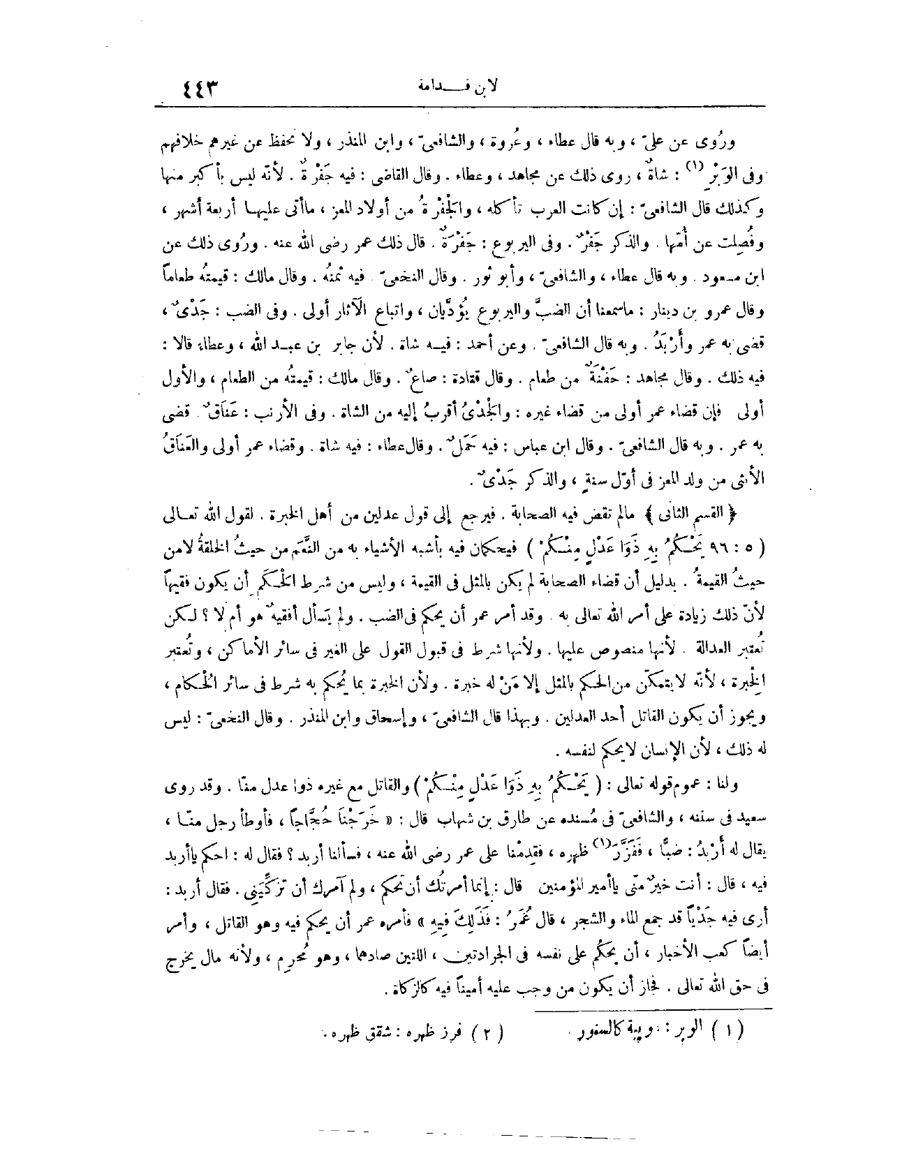 وَفِي الْأَرْنَبِ عَنَاقٌ. قَضَى بِهِ عُمَرُ. وَبِهِ قَالَ الشَّافِعِيُّ. وَقَالَ ابْنُ عَبَّاسٍ: فِيهِ حَمَلٌ. وَقَالَ عَطَاءٌ: فِيهِ شَاةٌ. وَقَضَاءُ عُمَرَ أَوْلَى. وَالْعَنَاقُ: الْأُنْثَى مِنْ وَلَدِ الْمَعْزِ فِي أَوَّلِ سَنَةٍ، وَالذَّكَرُ جَدْيٌ. الْقِسْمُ الثَّانِي، مَا لَمْ تَقْضِ فِيهِ الصَّحَابَةُ، فَيُرْجَعُ إلَى قَوْلِ عَدْلَيْنِ مِنْ أَهْلِ الْخِبْرَةِ؛ لِقَوْلِ اللَّهِ تَعَالَى: {يَحْكُمُ بِهِ ذَوَا عَدْلٍ مِنْكُمْ} [المائدة: ٩٥] . فَيَحْكُمَانِ فِيهِ بِأَشْبَهِ الْأَشْيَاءِ مِنْ النَّعَمِ، مِنْ حَيْثُ الْخِلْقَةُ، لَا مِنْ حَيْثُ الْقِيمَةُ، بِدَلِيلِ أَنَّ قَضَاءَ الصَّحَابَةِ لَمْ يَكُنْ بِالْمِثْلِ فِي الْقِيمَةِ، وَلَيْسَ مِنْ شَرْطِ الْحَكَمِ أَنْ يَكُونَ فَقِيهًا؛ لِأَنَّ ذَلِكَ زِيَادَةٌ عَلَى أَمْرِ اللَّهِ تَعَالَى بِهِ، وَقَدْ أَمَرَ عُمَرُ أَنْ يَحْكُمَ فِي الضَّبِّ، وَلَمْ يَسْأَلْ أَفَقِيهٌ هُوَ أَمْ لَا؟ لَكِنْ تُعْتَبَرُ الْعَدَالَةُ؛ لِأَنَّهَا مَنْصُوصٌ عَلَيْهَا، وَلِأَنَّهَا شَرْطٌ فِي قَبُولِ الْقَوْلِ عَلَى الْغَيْرِ فِي سَائِرِ الْأَمَاكِنِ، وَتُعْتَبَرُ الْخِبْرَةُ؛ لِأَنَّهُ لَا يَتَمَكَّنُ مِنْ الْحُكْمِ بِالْمِثْلِ إلَّا مَنْ لَهُ خِبْرَةٌ، وَلِأَنَّ الْخِبْرَةَ بِمَا يَحْكُمُ بِهِ شَرْطٌ فِي سَائِرِ الْحُكَّامِ.