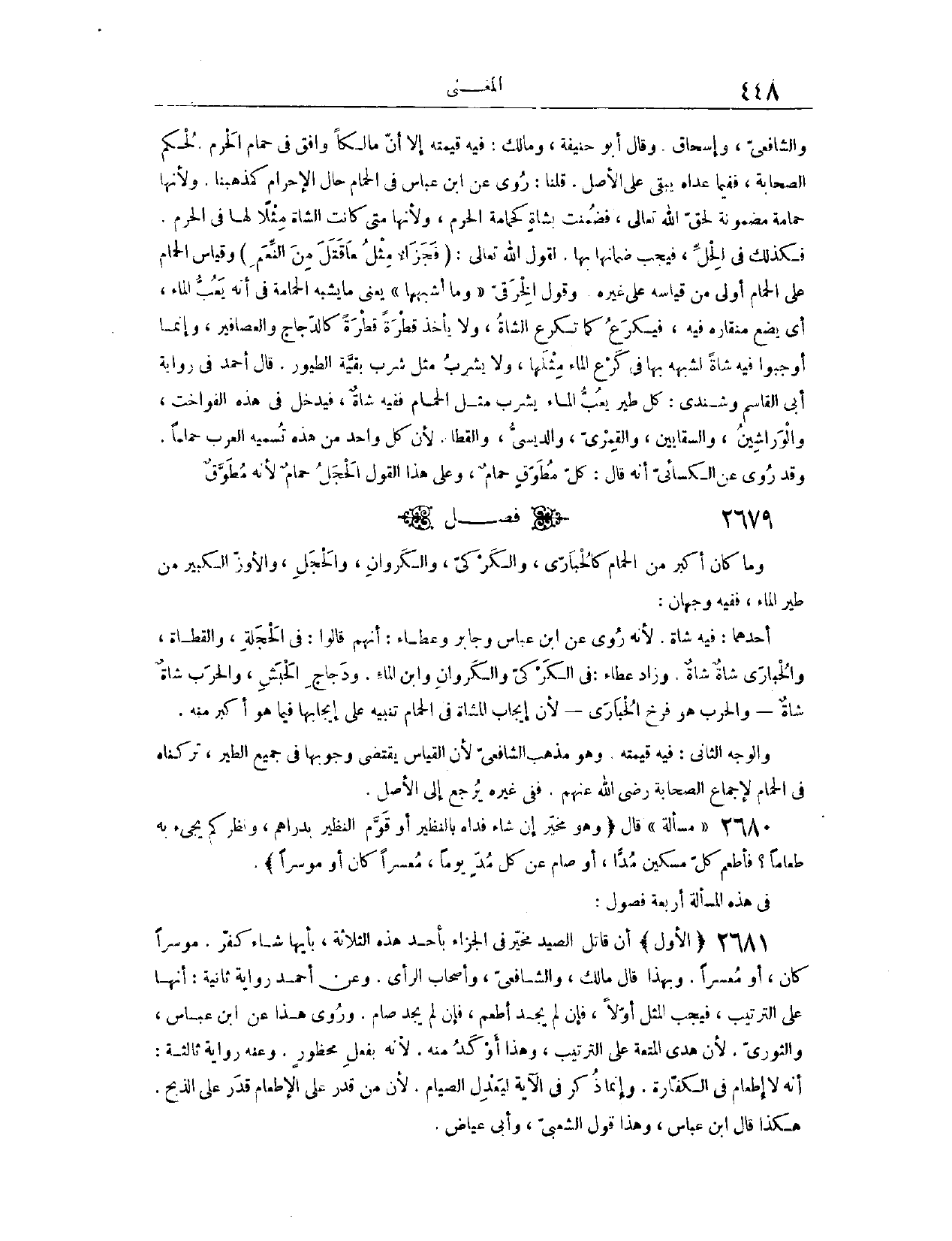 (٢٦٨٠) فَصْلٌ: وَمَا كَانَ أَكْبَرَ مِنْ الْحَمَامِ، كَالْحُبَارَى، وَالْكُرْكِيِّ، وَالْكَرَوَانُ، وَالْحَجَلِ وَالْإِوَزِّ الْكَبِيرِ مِنْ طَيْرِ الْمَاءِ، فَفِيهِ وَجْهَانِ؛ أَحَدُهُمَا، فِيهِ شَاةٌ؛ لِأَنَّهُ رُوِيَ عَنْ ابْنِ عَبَّاسٍ، وَجَابِرٍ، وَعَطَاءٍ، أَنَّهُمْ قَالُوا: فِي الْحَجَلَةِ وَالْقَطَاةِ وَالْحُبَارَى شَاةٌ شَاةٌ. وَزَادَ عَطَاءٌ: فِي الْكُرْكِيِّ والكروان وَابْنِ الْمَاءِ وَدَجَاجِ الْحَبَشِ وَالْحَرْب، شَاةٌ شَاةٌ. وَالْحَرْبُ: هُوَ فَرْخُ الْحُبَارَى. لِأَنَّ إيجَابَ الشَّاةِ فِي الْحَمَامِ تَنْبِيهٌ عَلَى إيجَابِهَا فِيمَا هُوَ أَكْبَرُ مِنْهُ. وَالْوَجْهُ الثَّانِي، فِيهِ قِيمَتُهُ، وَهُوَ مَذْهَبُ الشَّافِعِيِّ؛ لِأَنَّ الْقِيَاسَ يَقْتَضِي وُجُوبَهَا فِي جَمِيعِ الطَّيْرِ، تَرَكْنَاهُ فِي الْحَمَامِ لِإِجْمَاعِ الصَّحَابَةِ - رَضِيَ اللَّهُ عَنْهُمْ -، فَفِي غَيْرِهِ يُرْجَعُ إلَى الْأَصْلِ.