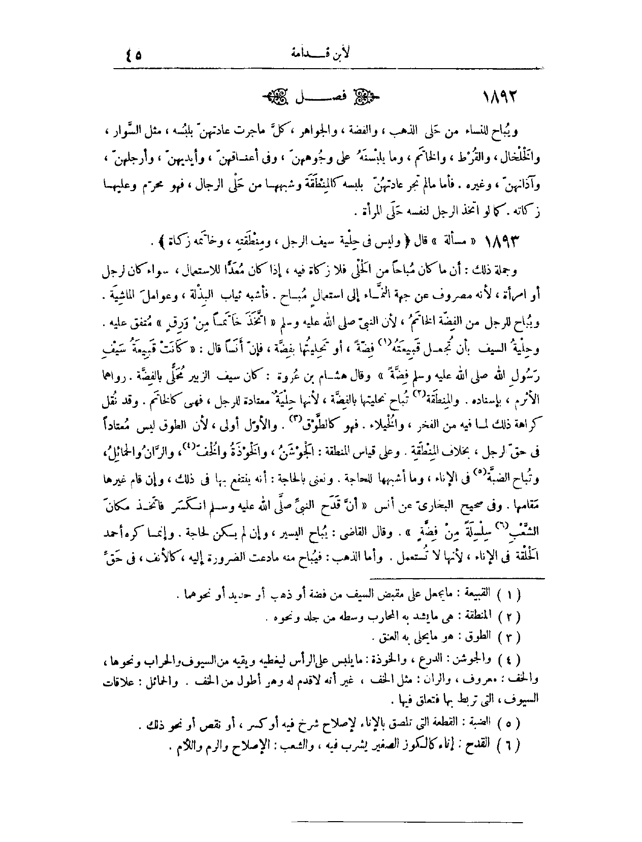 (١٨٩٢) فَصْلٌ: وَيُبَاحُ لِلنِّسَاءِ مِنْ حُلِيِّ الذَّهَبِ وَالْفِضَّةِ وَالْجَوَاهِرِ كُلُّ مَا جَرَتْ عَادَتُهُنَّ بِلُبْسِهِ، مِثْلُ السِّوَارِ وَالْخَلْخَالِ وَالْقُرْطِ وَالْخَاتَمِ، وَمَا يَلْبَسْنَهُ عَلَى وُجُوهِهِنَّ، وَفِي أَعْنَاقِهِنَّ، وَأَيْدِيهِنَّ، وَأَرْجُلِهِنَّ، وَآذَانِهِنَّ وَغَيْرِهِ، فَأَمَّا مَا لَمْ تَجْرِ عَادَتُهُنَّ بِلُبْسِهِ، كَالْمِنْطَقَةِ وَشِبْهِهَا مِنْ حُلِيِّ الرِّجَالِ، فَهُوَ مُحَرَّمٌ، وَعَلَيْهَا زَكَاتُهُ، كَمَا لَوْ اتَّخَذَ الرَّجُلُ لِنَفْسِهِ حُلِيَّ الْمَرْأَةِ.