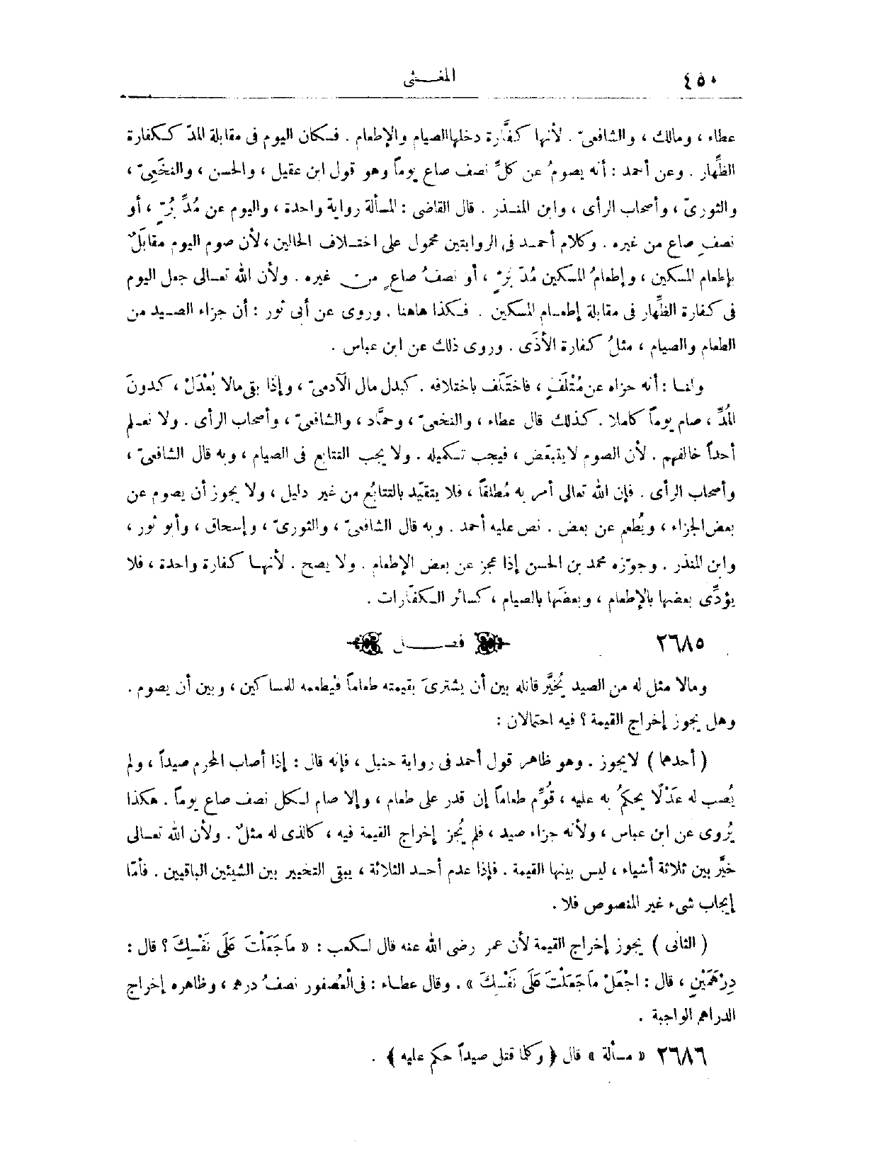 (٢٦٨٦) فَصْلٌ: وَمَا لَا مِثْلَ لَهُ مِنْ الصَّيْدِ، يُخَيَّرُ قَاتِلُهُ بَيْنَ أَنْ يَشْتَرِيَ بِقِيمَتِهِ طَعَامًا، فَيُطْعِمَهُ لِلْمَسَاكِينِ، وَبَيْنَ أَنْ يَصُومَ. وَهَلْ يَجُوزُ إخْرَاجُ الْقِيمَةِ؟ فِيهِ احْتِمَالَانِ؛ أَحَدُهُمَا، لَا يَجُوزُ. وَهُوَ ظَاهِرُ قَوْلِ أَحْمَدَ، فِي رِوَايَةِ حَنْبَلٍ، فَإِنَّهُ قَالَ: إذَا أَصَابَ الْمُحْرِمُ صَيْدًا، وَلَمْ يُصِبْ لَهُ عَدْلًا يُحْكَمُ بِهِ عَلَيْهِ؛ قَوَّمَ طَعَامًا إنْ قَدَرَ عَلَى طَعَامٍ، وَإِلَّا صَامَ لِكُلِّ نِصْفِ صَاعٍ يَوْمًا. هَكَذَا يُرْوَى عَنْ ابْنِ عَبَّاسٍ.