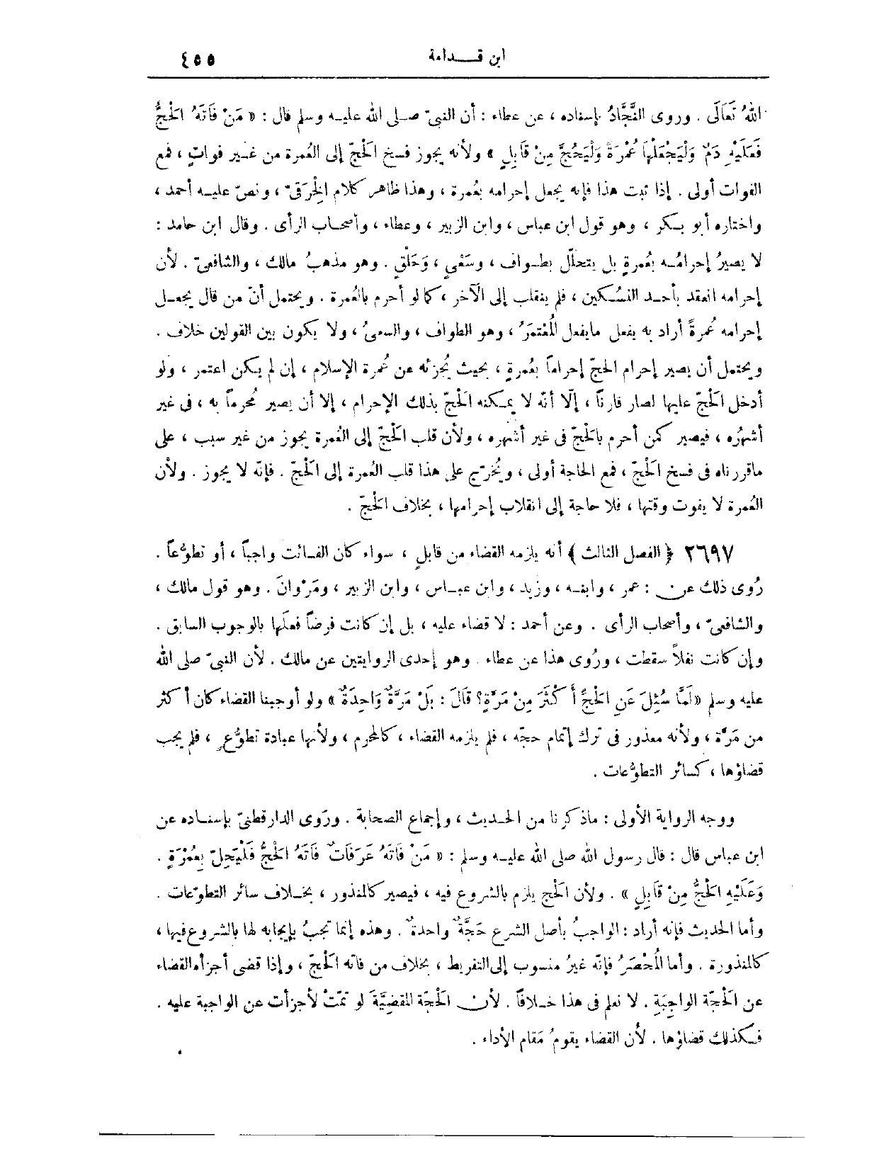 الْفَصْلُ الثَّالِثُ، أَنَّهُ يَلْزَمُهُ الْقَضَاءُ مِنْ قَابِلٍ، سَوَاءٌ كَانَ الْفَائِتُ وَاجِبًا، أَوْ تَطَوُّعًا. رُوِيَ ذَلِكَ عَنْ عُمَرَ، وَابْنِهِ، وَزَيْدٍ، وَابْنِ عَبَّاسٍ، وَابْنِ الزُّبَيْرِ، وَمَرْوَانَ، وَهُوَ قَوْلُ مَالِكٍ، وَالشَّافِعِيِّ، وَأَصْحَابِ الرَّأْيِ.