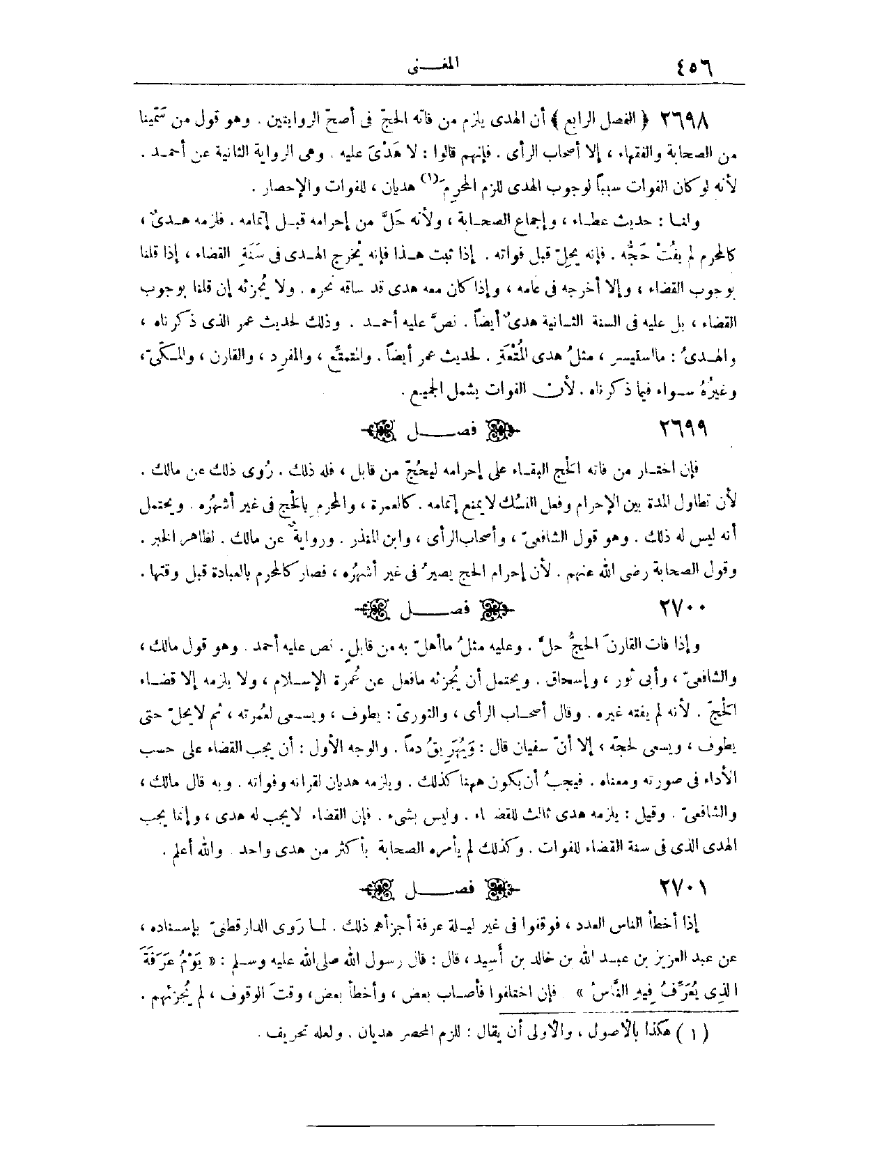 (٢٦٩٩) الْفَصْلُ الرَّابِعُ، أَنَّ الْهَدْيَ يَلْزَمُ مَنْ فَاتَهُ الْحَجُّ فِي أَصَحِّ الرِّوَايَتَيْنِ. وَهُوَ قَوْلُ مَنْ سَمَّيْنَا مِنْ الصَّحَابَةِ، وَالْفُقَهَاءِ، إلَّا أَصْحَابَ الرَّأْيِ، فَإِنَّهُمْ قَالُوا: لَا هَدْيَ عَلَيْهِ. وَهِيَ الرِّوَايَةُ الثَّانِيَةُ عَنْ أَحْمَدَ؛ لِأَنَّهُ لَوْ كَانَ الْفَوَاتُ سَبَبًا لِوُجُوبِ الْهَدْيِ، لَلَزِمَ الْمُحْرِمَ هَدْيَانِ؛ لِلْفَوَاتِ وَالْإِحْصَارِ.