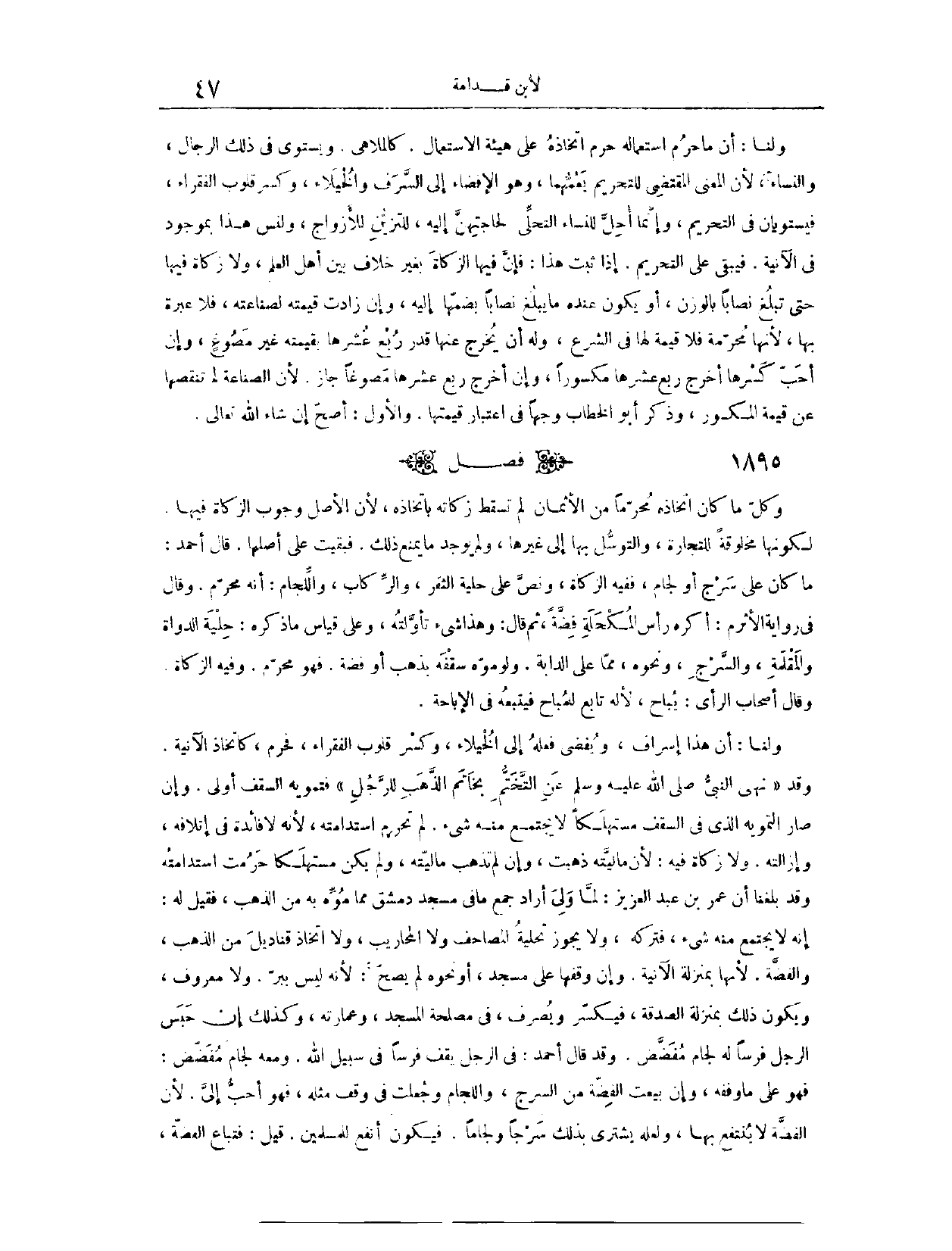 (١٨٩٥) فَصْلٌ: وَكُلُّ مَا كَانَ اتِّخَاذُهُ مُحَرَّمًا مِنْ الْأَثْمَانِ، لَمْ تَسْقُطْ زَكَاتُهُ بِاِتِّخَاذِهِ؛ لِأَنَّ الْأَصْلَ وُجُوبُ الزَّكَاةِ فِيهَا، لِكَوْنِهَا مَخْلُوقَةً لِلتِّجَارَةِ، وَالتَّوَسُّلِ بِهَا إلَى غَيْرِهَا، وَلَمْ يُوجَدْ مَا يَمْنَعُ ذَلِكَ، فَبَقِيَتْ عَلَى أَصْلِهَا.