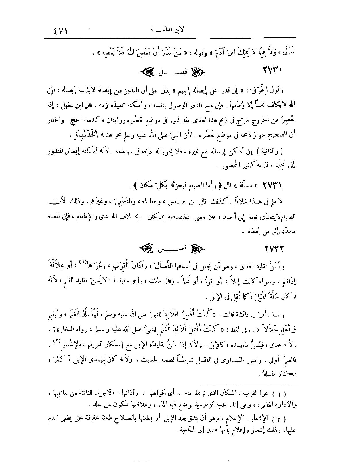 وَقَوْلِهِ: «مَنْ نَذَرَ أَنْ يَعْصِيَ اللَّهَ فَلَا يَعْصِهِ» . (٢٧٣١) فَصْلٌ: وَقَوْلُ الْخِرَقِيِّ: " إنْ قَدَرَ عَلَى إيصَالِهِ إلَيْهِمْ ". يَدُلُّ عَلَى أَنَّ الْعَاجِزَ عَنْ إيصَالِهِ لَا يَلْزَمُهُ إيصَالُهُ، فَإِنَّ اللَّهَ لَا يُكَلِّفُ نَفْسًا إلَّا وُسْعَهَا. فَإِنْ مُنِعَ النَّاذِرُ الْوُصُولَ بِنَفْسِهِ، وَأَمْكَنَهُ تَنْفِيذُهُ، لَزِمَهُ. قَالَ ابْنُ عَقِيلٍ إذَا حُصِرَ عَنْ الْخُرُوجِ خُرِّجَ فِي ذَبْحِ هَذَا الْهَدْيِ الْمَنْذُورِ فِي مَوْضِعِ حَصْرِهِ رِوَايَتَانِ، كَدِمَاءِ الْحَجِّ وَاخْتَارَ أَنَّ الصَّحِيحَ جَوَازُ ذَبْحِهِ فِي مَوْضِعِ حَصْرِهِ؛ لِأَنَّ النَّبِيَّ - صَلَّى اللَّهُ عَلَيْهِ وَسَلَّمَ - نَحَرَ هَدْيَهُ بِالْحُدَيْبِيَةِ. وَالثَّانِيَةُ، إنَّ أَمْكَنَ إرْسَالُهُ مَعَ غَيْرِهِ، فَلَا يَجُوزُ لَهُ ذَبْحُهُ فِي مَوْضِعِهِ؛ لِأَنَّهُ أَمْكَنَهُ إيصَالُ الْمَنْذُورِ إلَى مَحِلِّهِ، فَلَزِمَهُ، كَغَيْرِ الْمَحْصُورِ.