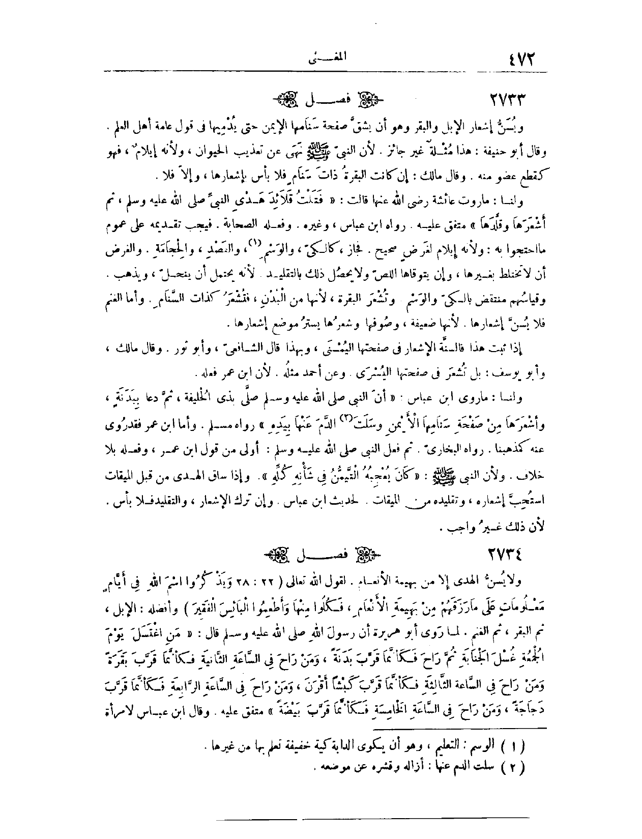 (٢٧٣٤) فَصْلٌ: وَيُسَنُّ إشْعَارُ الْإِبِلِ وَالْبَقَرِ، وَهُوَ أَنْ يَشُقَّ صَفْحَةَ سَنَامِهَا الْأَيْمَنِ حَتَّى يُدْمِيَهَا، فِي قَوْلِ عَامَّةِ أَهْلِ الْعِلْمِ. وَقَالَ أَبُو حَنِيفَةَ: هَذَا مُثْلَةٌ غَيْرُ جَائِزٍ؛ لِأَنَّ النَّبِيَّ - صَلَّى اللَّهُ عَلَيْهِ وَسَلَّمَ - نَهَى عَنْ تَعْذِيبِ الْحَيَوَانِ، وَلِأَنَّهُ إيلَامٌ، فَهُوَ كَقَطْعِ عُضْوٍ مِنْهُ. وَقَالَ مَالِكٌ: إنْ كَانَتْ الْبَقَرَةُ ذَاتَ سَنَامٍ، فَلَا بَأْسَ بِإِشْعَارِهَا، وَإِلَّا فَلَا.