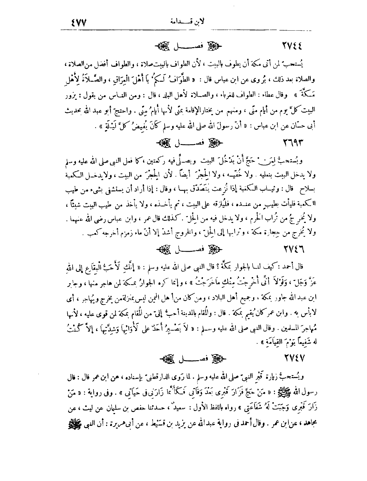 (٢٧٤٦) فَصْلٌ: وَيُسْتَحَبُّ لِمَنْ حَجَّ أَنْ يَدْخُلَ الْبَيْتَ، وَيُصَلِّي فِيهِ رَكْعَتَيْنِ، كَمَا فَعَلَ النَّبِيُّ - صَلَّى اللَّهُ عَلَيْهِ وَسَلَّمَ - وَلَا يَدْخُلُ الْبَيْتَ بِنَعْلَيْهِ، وَلَا خُفَّيْهِ، وَلَا الْحِجْرَ أَيْضًا؛ لِأَنَّ الْحِجْرَ مِنْ الْبَيْتِ. وَلَا يَدْخُلُ الْكَعْبَةَ بِسِلَاحٍ. قَالَ: وَثِيَابُ الْكَعْبَةِ إذَا نُزِعَتْ يُتَصَدَّقُ بِهَا. وَقَالَ: إذَا أَرَادَ أَنْ يَسْتَشْفِيَ بِشَيْءِ مِنْ طِيبِ الْكَعْبَةِ، فَلْيَأْتِ بِطِيبٍ مِنْ عِنْدِهِ، فَلْيَلْزِقْهُ عَلَى الْبَيْتِ، ثُمَّ يَأْخُذْهُ، وَلَا يَأْخُذْ مِنْ طِيبِ الْبَيْتِ شَيْئًا، وَلَا يُخْرِجْ مِنْ تُرَابِ الْحَرَمِ، وَلَا يُدْخِلْ فِيهِ مِنْ الْحِلِّ. كَذَلِكَ قَالَ عُمَرُ، وَابْنُ عَبَّاسٍ - رَضِيَ اللَّهُ عَنْهُمَا -، وَلَا يُخْرِجْ مِنْ حِجَارَةِ مَكَّةَ وَتُرَابِهَا إلَى الْحِلِّ، وَالْخُرُوجُ أَشَدُّ إلَّا أَنَّ مَاءَ زَمْزَمَ أَخْرَجَهُ كَعْبٌ.