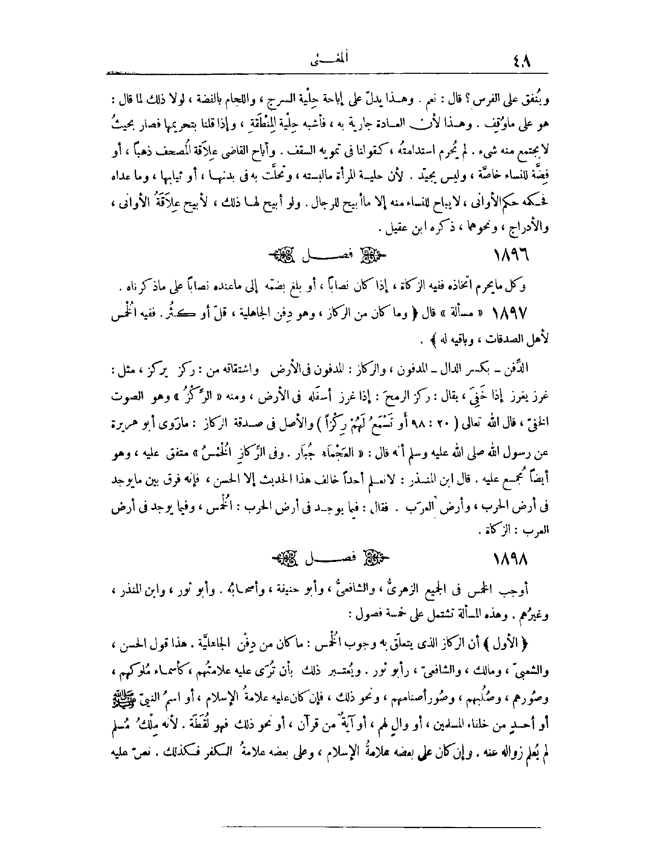 (١٨٩٨) فَصْلٌ: وَأَوْجَبَ الْخُمْسَ فِي الْجَمِيعِ الزُّهْرِيُّ، وَالشَّافِعِيُّ، وَأَبُو حَنِيفَةَ، وَأَصْحَابُهُ، وَأَبُو ثَوْرٍ، وَابْنُ الْمُنْذِرِ، وَغَيْرُهُمْ. وَهَذِهِ الْمَسْأَلَةُ تَشْتَمِلُ عَلَى خَمْسَةِ فُصُولٍ: (١٨٩٩) الْفَصْلُ الْأَوَّلُ، أَنَّ الرِّكَازَ الَّذِي يَتَعَلَّقُ بِهِ وُجُوبُ الْخُمْسِ مَا كَانَ مِنْ دِفْنِ الْجَاهِلِيَّةِ. هَذَا قَوْلُ الْحَسَنِ، وَالشَّعْبِيِّ، وَمَالِكٍ وَالشَّافِعِيِّ، وَأَبِي ثَوْرٍ.