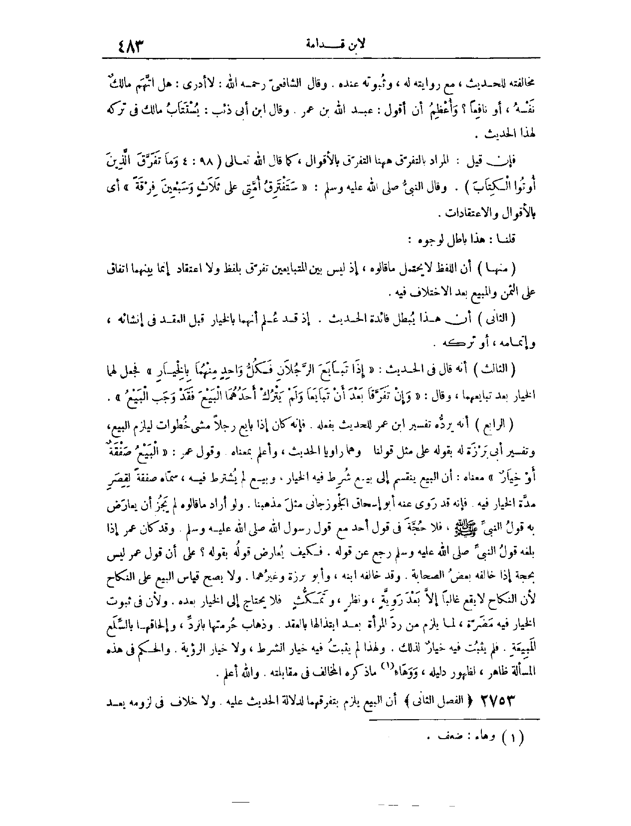 فَجَعَلَ لَهُمَا الْخِيَارَ بَعْدَ تَبَايُعِهِمَا، وَقَالَ: «وَإِنْ تَفَرَّقَا بَعْدَ أَنْ تَبَايَعَا، وَلَمْ يَتْرُكْ أَحَدُهُمَا الْبَيْعَ، فَقَدْ وَجَبَ الْبَيْعُ» . الرَّابِعُ، أَنَّهُ يَرُدُّهُ تَفْسِيرُ ابْنِ عُمَرَ لِلْحَدِيثِ بِفِعْلِهِ، فَإِنَّهُ كَانَ إذَا بَايَعَ رَجُلًا مَشَى خُطُوَاتٍ؛ لِيَلْزَمَ الْبَيْعُ، وَتَفْسِيرُ أَبِي بَرْزَةَ لَهُ، بِقَوْلِهِ عَلَى مِثْلِ قَوْلِنَا، وَهُمَا رَاوِيَا الْحَدِيثِ، وَأَعْلَمُ بِمَعْنَاهُ، وَقَوْلُ عُمَرَ: الْبَيْعُ صَفْقَةٌ أَوْ خِيَارٌ. مَعْنَاهُ، أَنَّ الْبَيْعَ يَنْقَسِمُ إلَى بَيْعٍ شُرِطَ فِيهِ الْخِيَارُ، وَبَيْعٍ لَمْ يُشْتَرَطْ فِيهِ، سَمَّاهُ صَفْقَةً لِقِصَرِ مُدَّةِ الْخِيَارِ فِيهِ، فَإِنَّهُ قَدْ رَوَى عَنْهُ أَبُو إِسْحَاقَ الْجُوزَجَانِيُّ مِثْلَ مَذْهَبِنَا، وَلَوْ أَرَادَ مَا قَالُوهُ، لَمْ يَجُزْ أَنْ يُعَارَضَ بِهِ قَوْلُ النَّبِيِّ - صَلَّى اللَّهُ عَلَيْهِ وَسَلَّمَ - فَلَا حُجَّةَ فِي قَوْلِ أَحَدٍ مَعَ قَوْلِ النَّبِيِّ - صَلَّى اللَّهُ عَلَيْهِ وَسَلَّمَ -
