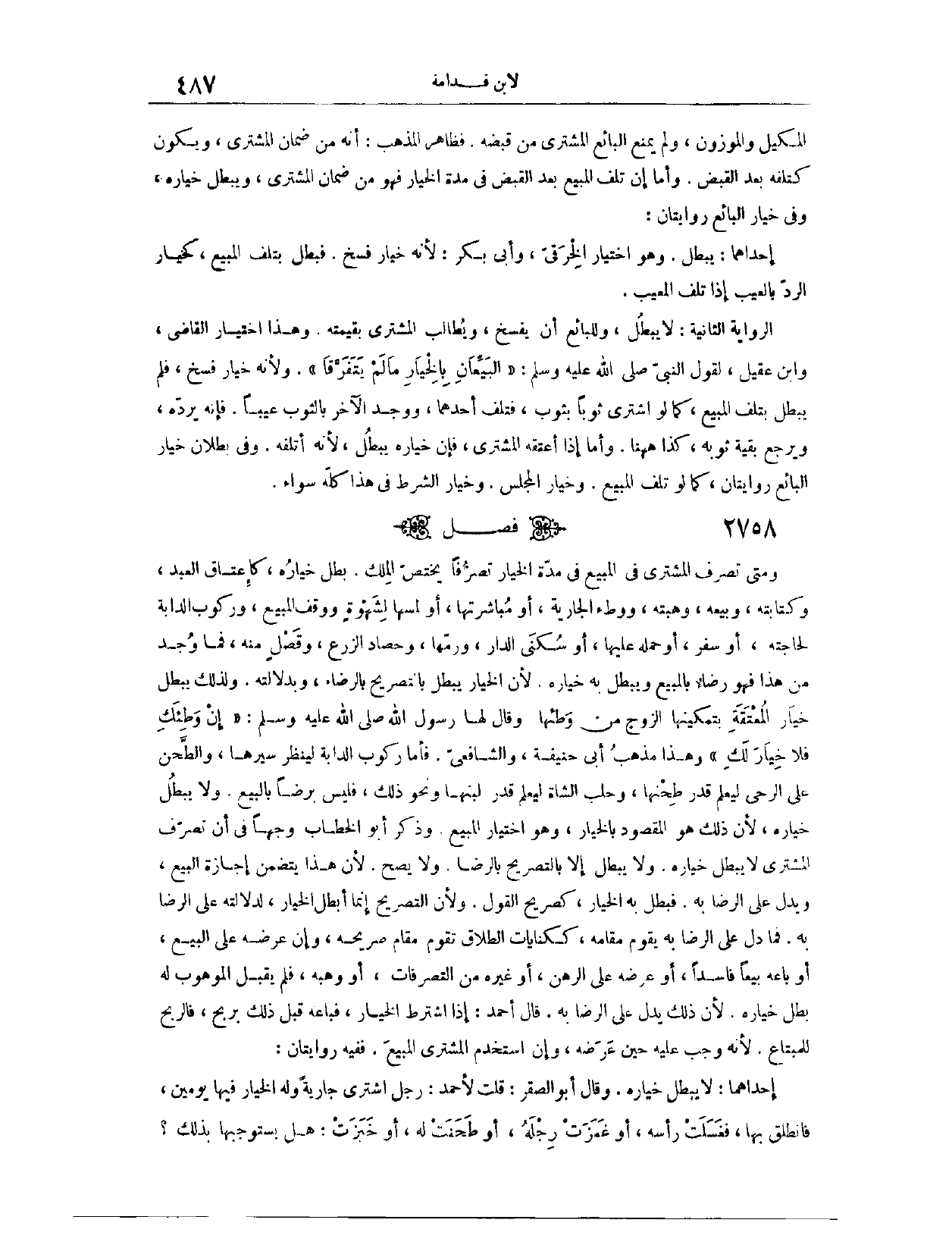 (٢٧٥٩) فَصْلٌ: وَمَتَى تَصَرَّفَ الْمُشْتَرِي فِي الْمَبِيعِ فِي مُدَّةِ الْخِيَارِ تَصَرُّفًا يَخْتَصُّ الْمِلْكَ، بَطَلَ خِيَارُهُ، كَإِعْتَاقِ الْعَبْدِ، وَكِتَابَتِهِ، وَبَيْعِهِ، وَهِبَتِهِ، وَوَطْءِ الْجَارِيَةِ، أَوْ مُبَاشَرَتِهَا، أَوْ لَمْسِهَا لِشَهْوَةِ، وَوَقْفِ الْمَبِيعِ، وَرُكُوبِ الدَّابَّةِ لِحَاجَتِهِ، أَوْ سَفَرٍ، أَوْ حَمْلِهِ عَلَيْهَا، أَوْ سُكْنَى الدَّارِ، وَرَمِّهَا، وَحَصَادِ الزَّرْعِ، وَقَصْلٍ مِنْهُ، فَمَا وُجِدَ مِنْ هَذَا فَهُوَ رِضَاءٌ بِالْمَبِيعِ، وَيَبْطُلُ بِهِ خِيَارُهُ؛ لِأَنَّ الْخِيَارَ يَبْطُلُ بِالتَّصْرِيحِ بِالرِّضَاءِ، وَبِدَلَالَتِهِ، وَلِذَلِكَ يَبْطُلُ خِيَارُ الْمُعْتَقَةِ بِتَمْكِينِهَا الزَّوْجَ مِنْ وَطْئِهَا، «وَقَالَ لَهَا رَسُولُ اللَّهِ - صَلَّى اللَّهُ عَلَيْهِ وَسَلَّمَ -: إنْ وَطِئَك فَلَا خِيَارَ لَك» .