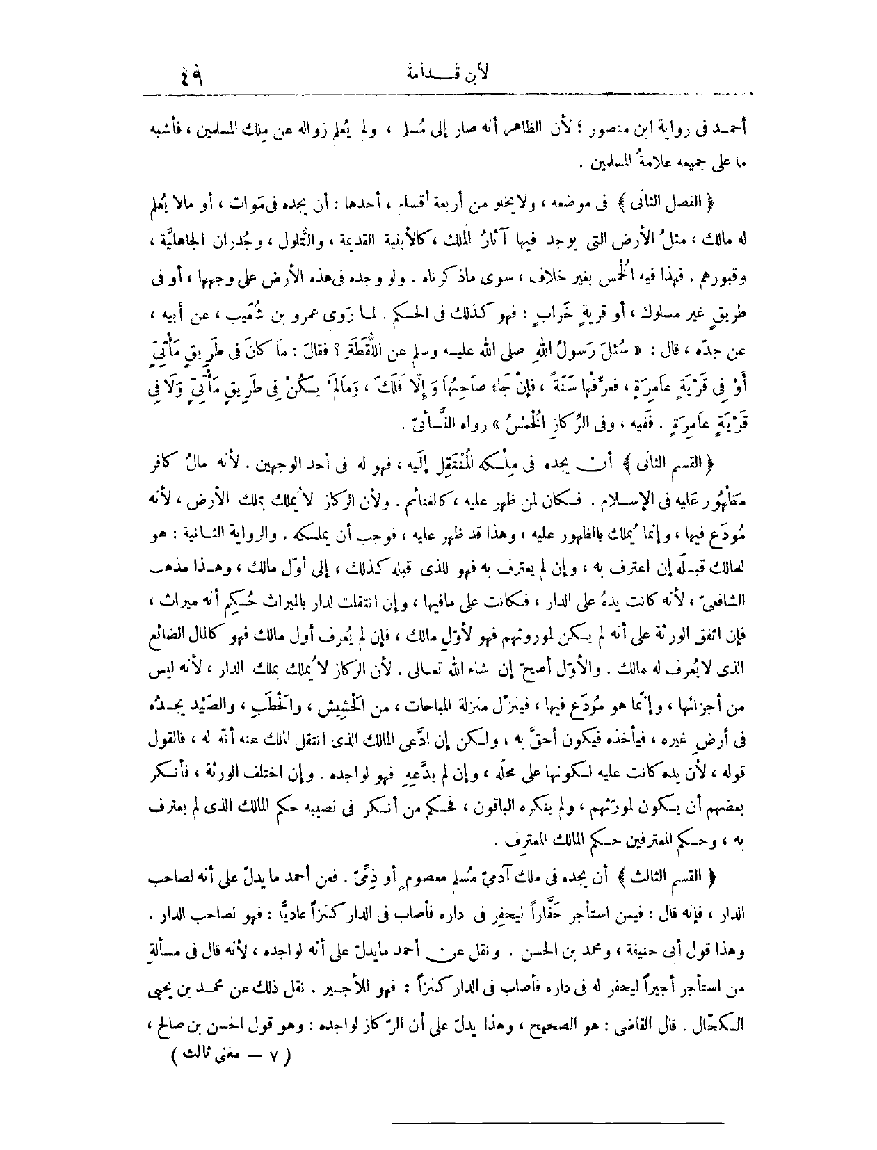 وَإِنْ اخْتَلَفَ الْوَرَثَةُ، فَأَنْكَرَ بَعْضُهُمْ أَنْ يَكُونَ لِمُوَرِّثِهِمْ، وَلَمْ يُنْكِرْهُ الْبَاقُونَ، فَحُكْمُ مَنْ أَنْكَرَ فِي نَصِيبِهِ حُكْمُ الْمَالِكِ الَّذِي لَمْ يَعْتَرِفْ بِهِ، وَحُكْمُ الْمُعْتَرِفِينَ حُكْمُ الْمَالِكِ الْمُعْتَرِفِ. الْقِسْمُ الثَّالِثُ، أَنْ يَجِدَهُ فِي مِلْكِ آدَمِيٍّ مُسْلِمٍ مَعْصُومٍ أَوْ ذِمِّيٍّ، فَعَنْ أَحْمَدَ مَا يَدُلُّ عَلَى أَنَّهُ لِصَاحِبِ الدَّارِ؛ فَإِنَّهُ قَالَ، فِي مَنْ اسْتَأْجَرَ حَفَّارًا لِيَحْفِرَ فِي دَارِهِ، فَأَصَابَ فِي الدَّارِ كَنْزًا عَادِيًّا: فَهُوَ لِصَاحِبِ الدَّارِ. وَهَذَا قَوْلُ أَبِي حَنِيفَةَ وَمُحَمَّدِ بْنِ الْحَسَنِ.