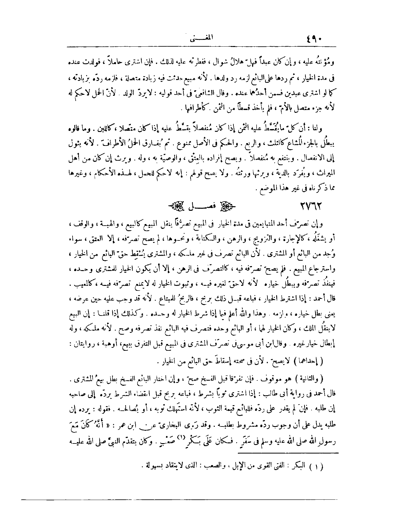 وَإِنْ كَانَ عَبْدًا، فَهَلَّ هِلَالُ شَوَّالٍ، فَفِطْرَتُهُ عَلَيْهِ لِذَلِكَ. فَإِنْ اشْتَرَى حَامِلًا، فَوَلَدَتْ عِنْدَهُ فِي مُدَّةِ الْخِيَارِ، ثُمَّ رَدَّهَا عَلَى الْبَائِعِ، لَزِمَهُ رَدُّ وَلَدِهَا؛ لِأَنَّهُ مَبِيعٌ حَدَثَتْ فِيهِ بِزِيَادَةِ مُتَّصِلَةٌ، فَلَزِمَهُ رَدُّهُ بِزِيَادَتِهِ، كَمَا لَوْ اشْتَرَى عَبْدَيْنِ، فَسَمِنَ أَحَدُهُمَا عِنْدَهُ. وَقَالَ الشَّافِعِيُّ فِي أَحَدِ قَوْلَيْهِ: لَا يَرُدُّ الْوَلَدَ؛ لِأَنَّ الْحَمْلَ لَا حُكْمَ لَهُ؛ لِأَنَّهُ جُزْءٌ مُتَّصِلٌ بِالْأُمِّ، فَلَمْ يَأْخُذْ قِسْطًا مِنْ الثَّمَنِ، كَأَطْرَافِهَا. وَلَنَا، أَنَّ كُلَّ مَا يُقَسَّطُ عَلَيْهِ الثَّمَنُ إذَا كَانَ مُنْفَصِلًا، يُقَسَّطُ عَلَيْهِ إذَا كَانَ مُتَّصِلًا، كَاللَّبَنِ. وَمَا قَالُوهُ يَبْطُلُ بِالْجُزْءِ الْمُشَاعِ، كَالثُّلُثِ، وَالرُّبْعِ، وَالْحُكْمُ فِي الْأَصْلِ مَمْنُوعٌ، ثُمَّ يُفَارِقُ الْحَمْلُ الْأَطْرَافَ؛ لِأَنَّهُ يَئُولُ إلَى الِانْفِصَالِ، وَيُنْتَفَعُ بِهِ مُنْفَصِلًا، وَيَصِحُّ إفْرَادُهُ بِالْعِتْقِ، وَالْوَصِيَّةُ بِهِ، وَلَهُ، وَيَرِثُ إنْ كَانَ مِنْ أَهْلِ الْمِيرَاثِ، وَيُفْرَدُ بِالدِّيَةِ، وَيَرِثُهَا وَرَثَتُهُ. وَلَا يَصِحُّ قَوْلُهُمْ: إنَّهُ لَا حُكْمَ لِلْحَمْلِ. لِهَذِهِ الْأَحْكَامِ وَغَيْرِهَا مِمَّا ذَكَرْنَاهُ فِي غَيْرِ هَذَا الْمَوْضِعِ.