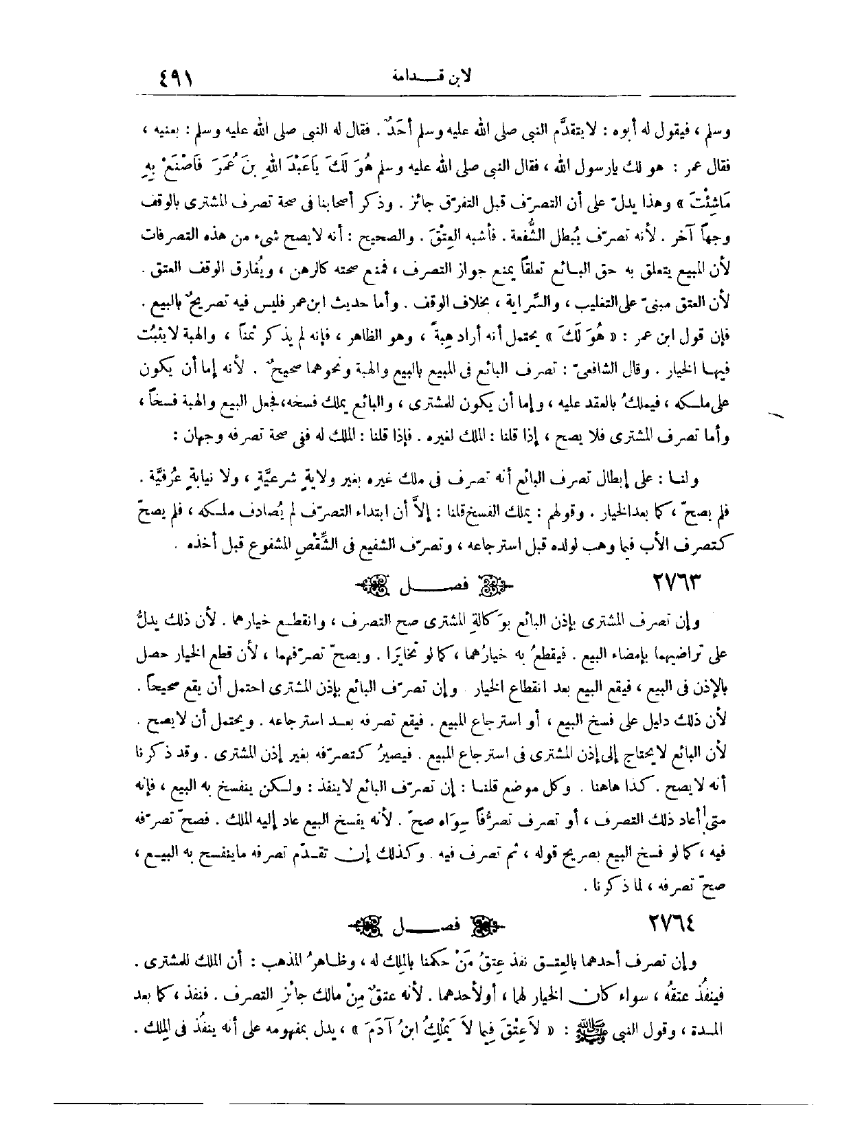 (٢٧٦٤) فَصْلٌ: وَإِنْ تَصَرَّفَ الْمُشْتَرِي بِإِذْنِ الْبَائِعِ، أَوْ الْبَائِعِ بِوِكَالَةِ الْمُشْتَرِي، صَحَّ التَّصَرُّفُ، وَانْقَطَعَ خِيَارُهُمَا؛ لِأَنَّ ذَلِكَ يَدُلُّ عَلَى تَرَاضِيهِمَا بِإِمْضَاءِ الْبَيْعِ، فَيُقْطَعُ بِهِ خِيَارُهُمَا، كَمَا لَوْ تَخَايَرَا، وَيَصِحُّ تَصَرُّفُهُمَا؛ لِأَنَّ قَطْعَ الْخِيَارِ حَصَلَ بِالْإِذْنِ فِي الْبَيْعِ، فَيَقَعُ الْبَيْعُ بَعْدَ انْقِطَاعِ الْخِيَارِ.