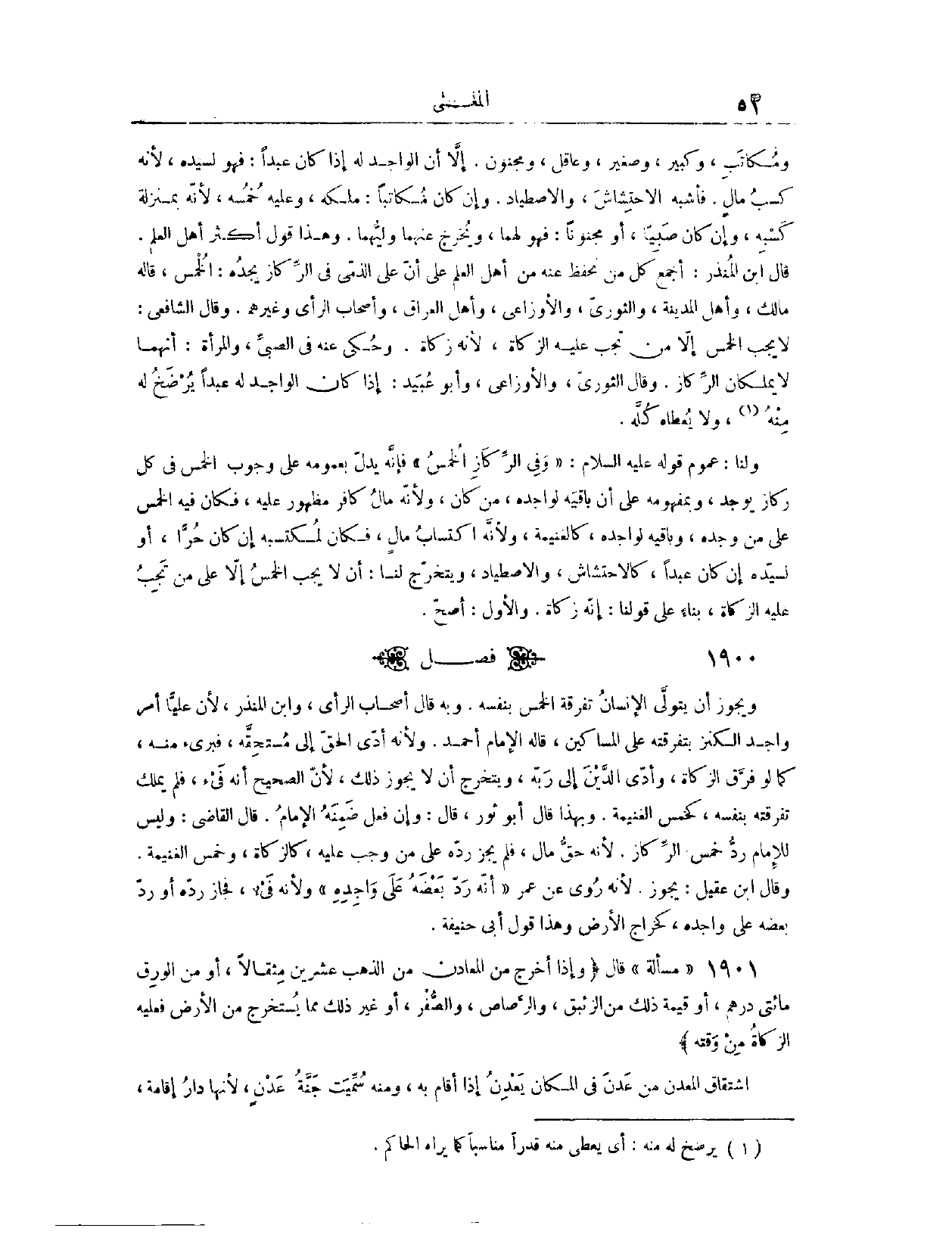 (١٩٠٦) مَسْأَلَةٌ: قَالَ: (وَإِذَا أَخْرَجَ مِنْ الْمَعَادِنِ مِنْ الذَّهَبِ عِشْرِينَ مِثْقَالًا، أَوْ مِنْ الْوَرِقِ مِائَتَيْ دِرْهَمٍ، أَوْ قِيمَةَ ذَلِكَ مِنْ الزِّئْبَقِ وَالرَّصَاصِ وَالصُّفْرِ أَوْ غَيْرِ ذَلِكَ مِمَّا يُسْتَخْرَجُ مِنْ الْأَرْضِ، فَعَلَيْهِ الزَّكَاةُ مِنْ وَقْتِهِ) اشْتِقَاقُ الْمَعْدِنِ مِنْ عَدَنَ فِي الْمَكَانِ، يَعْدِنُ: إذَا أَقَامَ بِهِ. وَمِنْهُ سُمِّيَتْ جَنَّةَ عَدْنٍ، لِأَنَّهَا دَارُ إقَامَةٍ