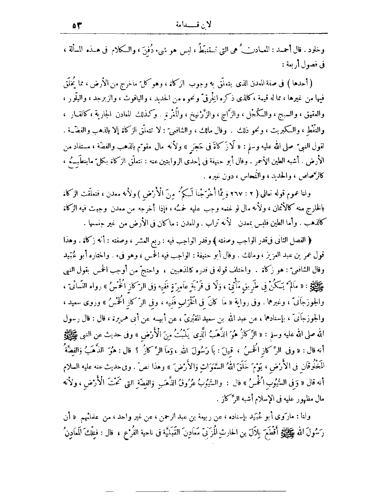 وَالْكَلَامُ فِي هَذِهِ الْمَسْأَلَةِ فِي فُصُولٍ أَرْبَعَةٍ: (١٩٠٧) أَحَدُهَا، فِي صِفَةِ الْمَعْدِنِ الَّذِي يَتَعَلَّقُ بِهِ وُجُوبُ الزَّكَاةِ. وَهُوَ كُلُّ مَا خَرَجَ مِنْ الْأَرْضِ، مِمَّا يُخْلَقُ فِيهَا مِنْ غَيْرِهَا مِمَّا لَهُ قِيمَةٌ، كَاَلَّذِي ذَكَرَهُ الْخِرَقِيِّ وَنَحْوِهِ مِنْ الْحَدِيدِ، وَالْيَاقُوتِ، وَالزَّبَرْجَدِ، وَالْبِلَّوْرِ، وَالْعَقِيقِ، وَالسَّبَجِ، وَالْكُحْلِ، وَالزَّاجِّ. وَالزِّرْنِيخِ، وَالْمَغْرَةِ. وَكَذَلِكَ الْمَعَادِنُ الْجَارِيَةُ، كَالْقَارِ، وَالنِّفْطِ، وَالْكِبْرِيتِ، وَنَحْوِ ذَلِكَ.