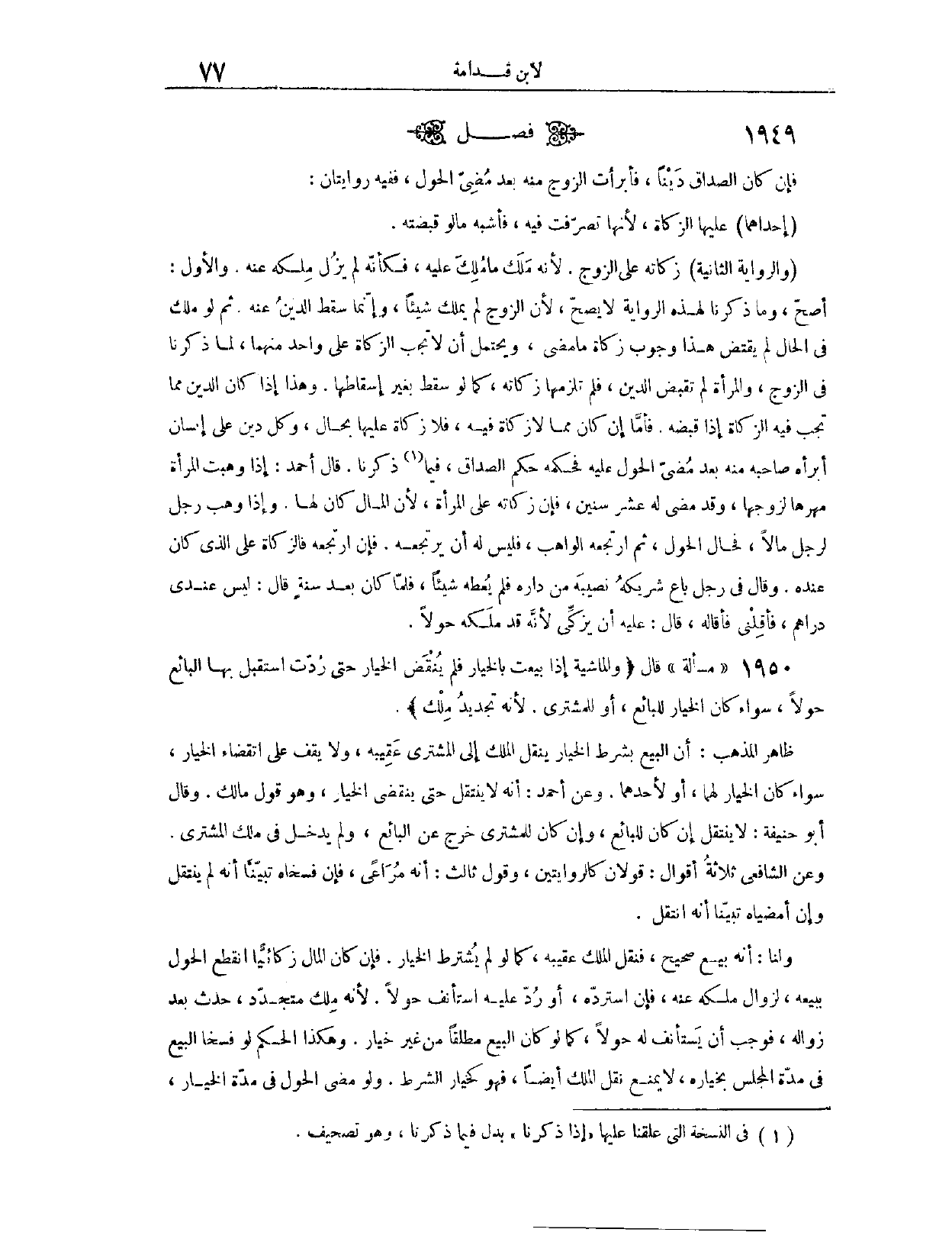 (١٩٥٠) فَصْلٌ: فَإِنْ كَانَ الصَّدَاقُ دَيْنًا، فَأَبْرَأَتْ الزَّوْجَ مِنْهُ بَعْدَ مُضِيِّ الْحَوْلِ، فَفِيهِ رِوَايَتَانِ؛ إحْدَاهُمَا، عَلَيْهَا الزَّكَاةُ؛ لِأَنَّهَا تَصَرَّفَتْ فِيهِ، فَأَشْبَهَ مَا لَوْ قَبَضَتْهُ وَالرِّوَايَةُ الثَّانِيَةُ، زَكَاتُهُ عَلَى الزَّوْجِ؛ لِأَنَّهُ مَلَكَ مَا مُلِّكَ عَلَيْهِ، فَكَأَنَّهُ لَمْ يَزُلْ مِلْكُهُ عَنْهُ. وَالْأَوَّلُ أَصَحُّ، وَمَا ذَكَرْنَا لِهَذِهِ الرِّوَايَةِ لَا يَصِحُّ؛ لِأَنَّ الزَّوْجَ لَمْ يَمْلِكْ شَيْئًا، وَإِنَّمَا سَقَطَ الدَّيْنُ عَنْهُ، ثُمَّ لَوْ مَلَكَ فِي الْحَالِ لَمْ يَقْتَضِ هَذَا وُجُوبَ زَكَاةِ مَا مَضَى.