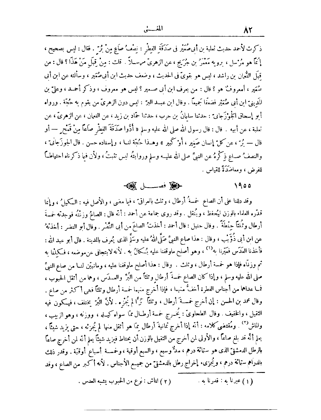 (١٩٥٦) فَصْلُ وَقَدْ دَلَّلْنَا عَلَى أَنَّ الصَّاعَ خَمْسَةُ أَرْطَالٍ وَثُلُثٌ بِالْعِرَاقِيِّ فِيمَا مَضَى وَالْأَصْلُ فِيهِ الْكَيْلُ، وَإِنَّمَا قَدَّرَهُ الْعُلَمَاءُ بِالْوَزْنِ لِيُحْفَظَ وَيُنْقَلَ. وَقَدْ رَوَى جَمَاعَةٌ عَنْ أَحْمَدَ، أَنَّهُ قَالَ: الصَّاعُ وَزَنْتُهُ فَوَجَدْتُهُ خَمْسَةَ أَرْطَالٍ وَثُلُثًا حِنْطَةً. وَقَالَ حَنْبَلٌ.