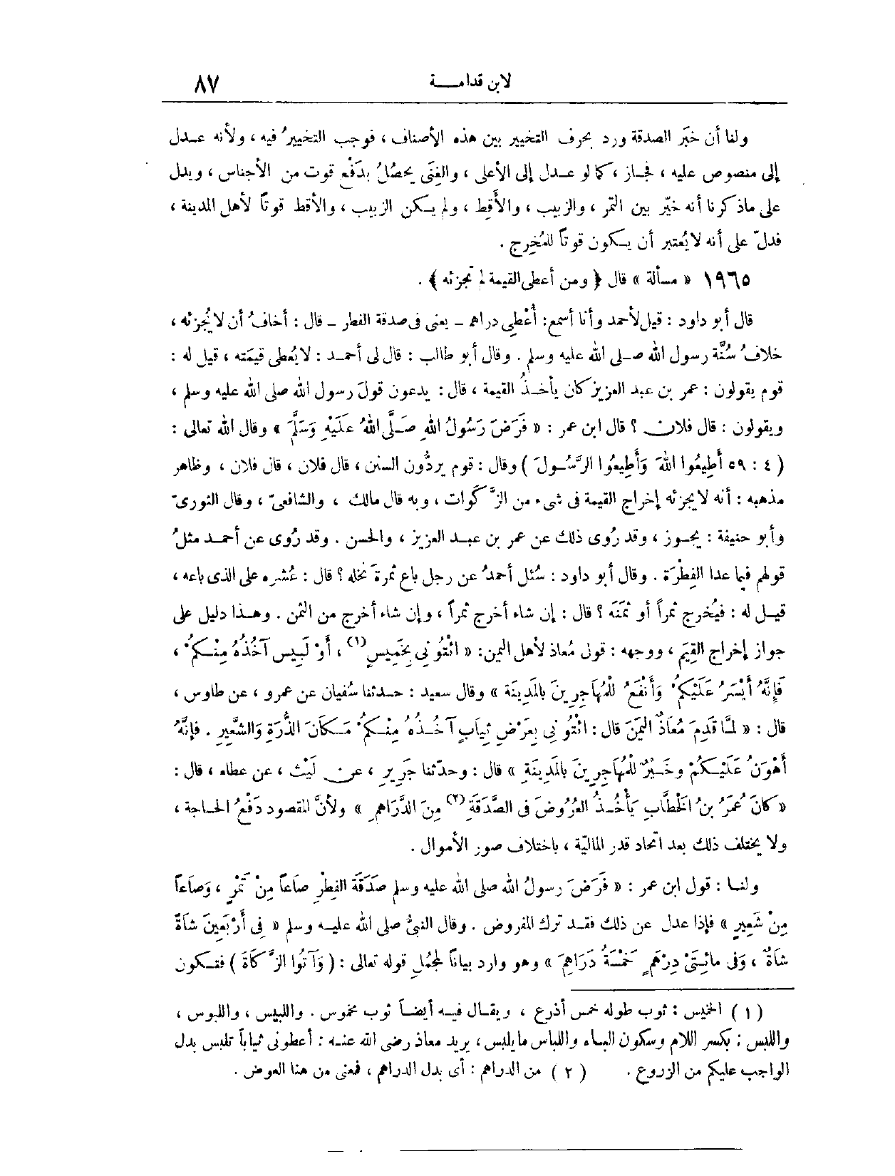 (١٩٦٦) مَسْأَلَةٌ: قَالَ: (وَمَنْ أَعْطَى الْقِيمَةَ، لَمْ تُجْزِئْهُ) قَالَ أَبُو دَاوُد قِيلَ لِأَحْمَدَ وَأَنَا أَسْمَعُ: أُعْطِي دَرَاهِمَ - يَعْنِي فِي صَدَقَةِ الْفِطْرِ - قَالَ: أَخَافُ أَنْ لَا يُجْزِئَهُ خِلَافُ سُنَّةِ رَسُولِ اللَّهِ - صَلَّى اللَّهُ عَلَيْهِ وَسَلَّمَ -. وَقَالَ أَبُو طَالِبٍ، قَالَ لِي أَحْمَدُ لَا يُعْطِي قِيمَتَهُ، قِيلَ لَهُ: قَوْمٌ يَقُولُونَ، عُمَرُ بْنُ عَبْدِ الْعَزِيزِ كَانَ يَأْخُذُ بِالْقِيمَةِ، قَالَ يَدَعُونَ قَوْلَ رَسُولِ اللَّهِ - صَلَّى اللَّهُ عَلَيْهِ وَسَلَّمَ - وَيَقُولُونَ قَالَ فُلَانٌ، قَالَ ابْنُ عُمَرَ: فَرَضَ رَسُولُ اللَّهِ - صَلَّى اللَّهُ عَلَيْهِ وَسَلَّمَ -. وَقَالَ اللَّهُ تَعَالَى: {أَطِيعُوا اللَّهَ وَأَطِيعُوا الرَّسُولَ} [النساء: ٥٩] . وَقَالَ قَوْمٌ يَرُدُّونَ السُّنَنَ: قَالَ فُلَانٌ، قَالَ فُلَانٌ. وَظَاهِرُ مَذْهَبِهِ أَنَّهُ لَا يُجْزِئُهُ إخْرَاجُ الْقِيمَةِ فِي شَيْءٍ مِنْ الزَّكَوَاتِ. وَبِهِ قَالَ مَالِكٌ، وَالشَّافِعِيُّ وَقَالَ الثَّوْرِيُّ، وَأَبُو حَنِيفَةَ: يَجُوزُ. وَقَدْ رُوِيَ ذَلِكَ عَنْ عُمَرَ بْنِ عَبْدِ الْعَزِيزِ، وَالْحَسَنِ، وَقَدْ رُوِيَ عَنْ أَحْمَدَ مِثْلُ قَوْلِهِمْ، فِيمَا عَدَا الْفِطْرَةَ.