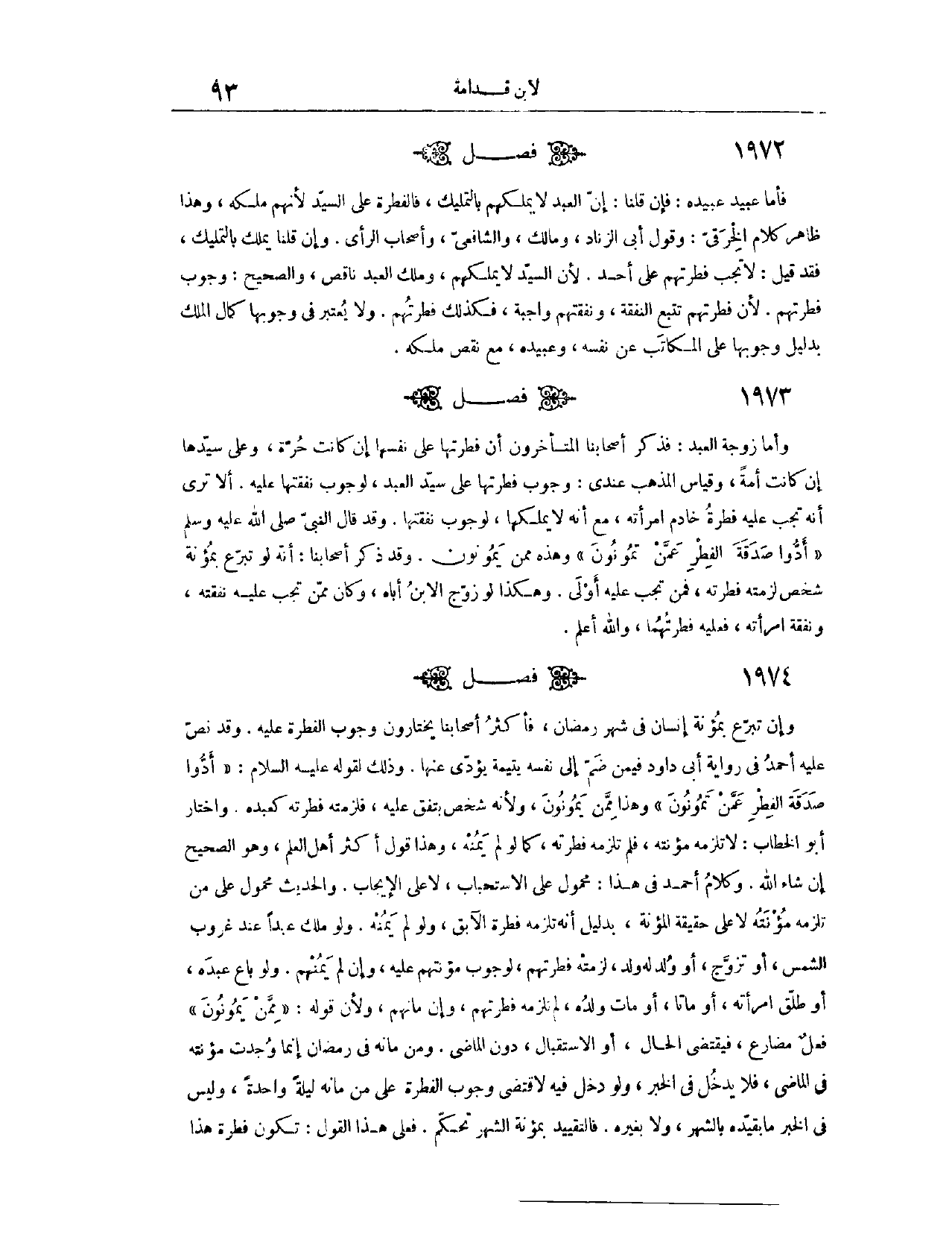 (١٩٧٤) فَصْلٌ: وَأَمَّا زَوْجَةُ الْعَبْدِ فَذَكَرَ أَصْحَابُنَا الْمُتَأَخِّرُونَ أَنَّ فِطْرَتَهَا عَلَى نَفْسِهَا إنْ كَانَتْ حُرَّةً، وَعَلَى سَيِّدِهَا إنْ كَانَتْ أَمَةً. وَقِيَاسُ الْمَذْهَبِ عِنْدِي وُجُوبُ فِطْرَتِهَا عَلَى سَيِّدِ الْعَبْدِ؛ لِوُجُوبِ نَفَقَتِهَا عَلَيْهِ، أَلَا تَرَى أَنَّهُ تَجِبُ عَلَيْهِ فِطْرَةُ خَادِمِ امْرَأَتِهِ، مَعَ أَنَّهُ لَا يَمْلِكُهَا؛ لِوُجُوبِ نَفَقَتِهَا، وَقَدْ قَالَ النَّبِيُّ - صَلَّى اللَّهُ عَلَيْهِ وَسَلَّمَ -: «أَدُّوا صَدَقَةَ الْفِطْرِ عَمَّنْ تَمُونُونَ» . وَهَذِهِ مِمَّنْ يَمُونُونَ. وَقَدْ ذَكَرَ أَصْحَابُنَا أَنَّهُ لَوْ تَبَرَّعَ بِمُؤْنَةِ شَخْصٍ، لَزِمَتْهُ فِطْرَتُهُ، فَمَنْ تَجِبُ عَلَيْهِ أَوْلَى. وَهَكَذَا لَوْ زَوَّجَ الِابْنُ أَبَاهُ، وَكَانَ مِمَّنْ تَجِبُ عَلَيْهِ نَفَقَتُهُ وَنَفَقَةُ امْرَأَتِهِ، فَعَلَيْهِ فِطْرَتُهُمَا، وَاَللَّهُ أَعْلَمُ