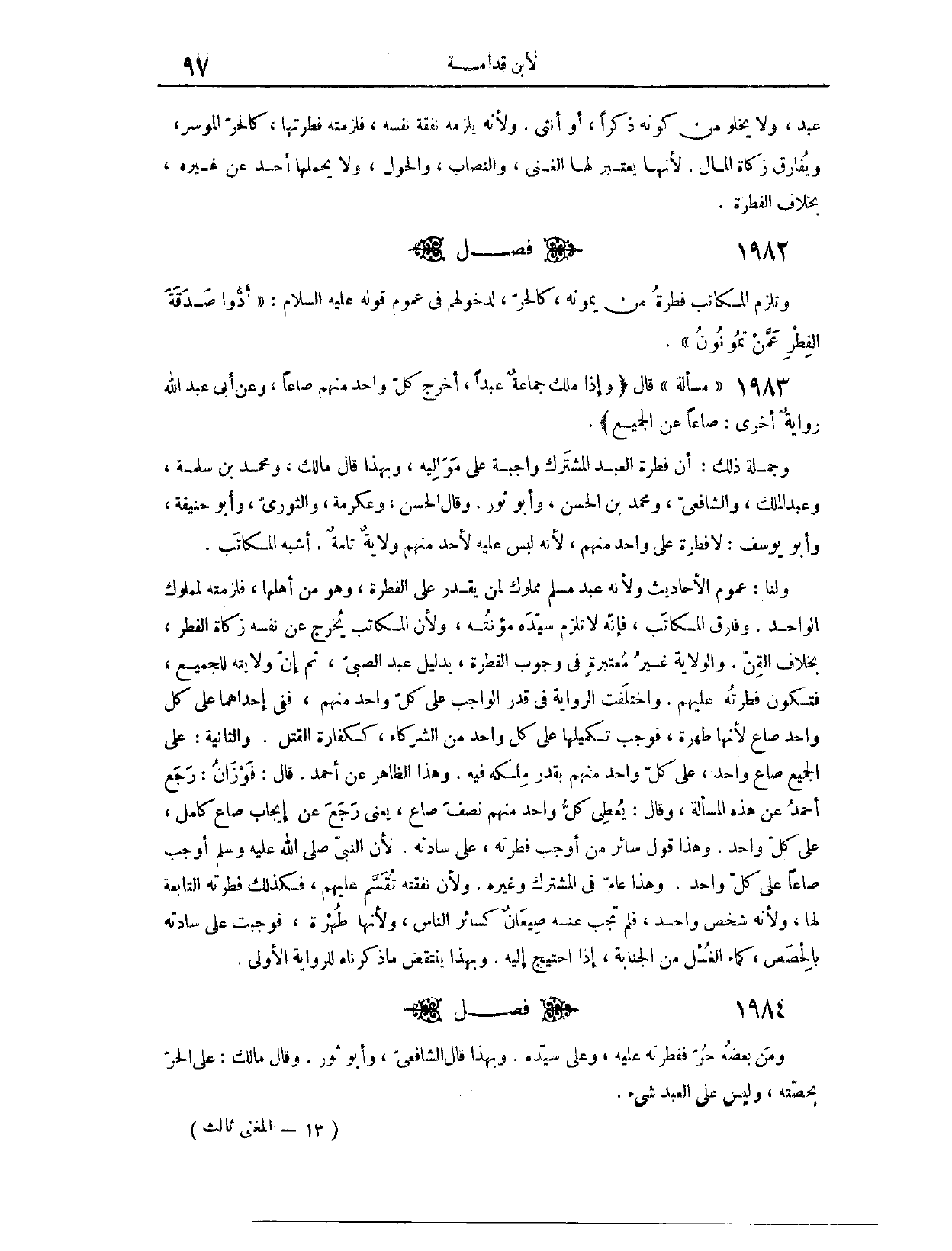 عَبْدٌ وَلَا يَخْلُو مِنْ كَوْنِهِ ذَكَرًا أَوْ أُنْثَى، وَلِأَنَّهُ يَلْزَمُهُ نَفَقَةُ نَفْسِهِ، فَلَزِمَتْهُ فِطْرَتُهَا كَالْحُرِّ الْمُوسِرِ وَيُفَارِقُ زَكَاةَ الْمَالِ؛ لِأَنَّهَا يُعْتَبَرُ لَهَا الْغِنَى وَالنِّصَابُ وَالْحَوْلُ، وَلَا يَحْمِلُهَا أَحَدٌ عَنْ غَيْرِهِ، بِخِلَافِ الْفِطْرَةِ. (١٩٨٣) فَصْلٌ: وَتَلْزَمُ الْمُكَاتَبَ فِطْرَةُ مِنْ يَمُونُهُ كَالْحُرِّ؛ لِدُخُولِهِمْ فِي عُمُومِ قَوْلِهِ عَلَيْهِ السَّلَامُ: «أَدُّوا صَدَقَةَ الْفِطْرِ عَمَّنْ تَمُونُونَ»
