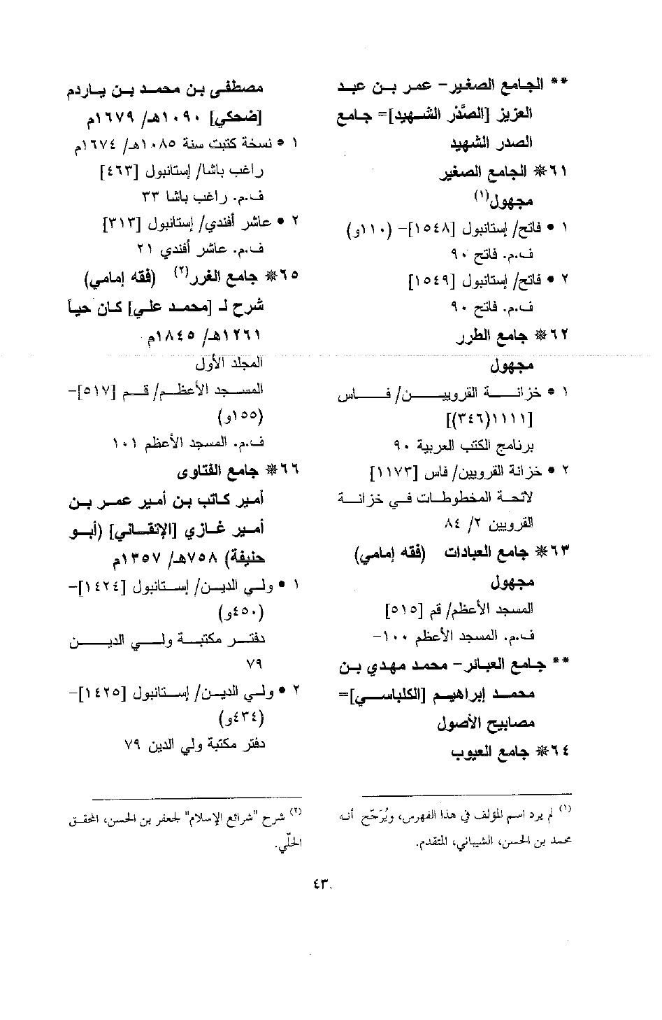 (1) كتاب يجمع بين "فصول الأسروشني" (محمد بن محمود) و "فصول العمادي" (جمال الدين ابن عماد الدين).
