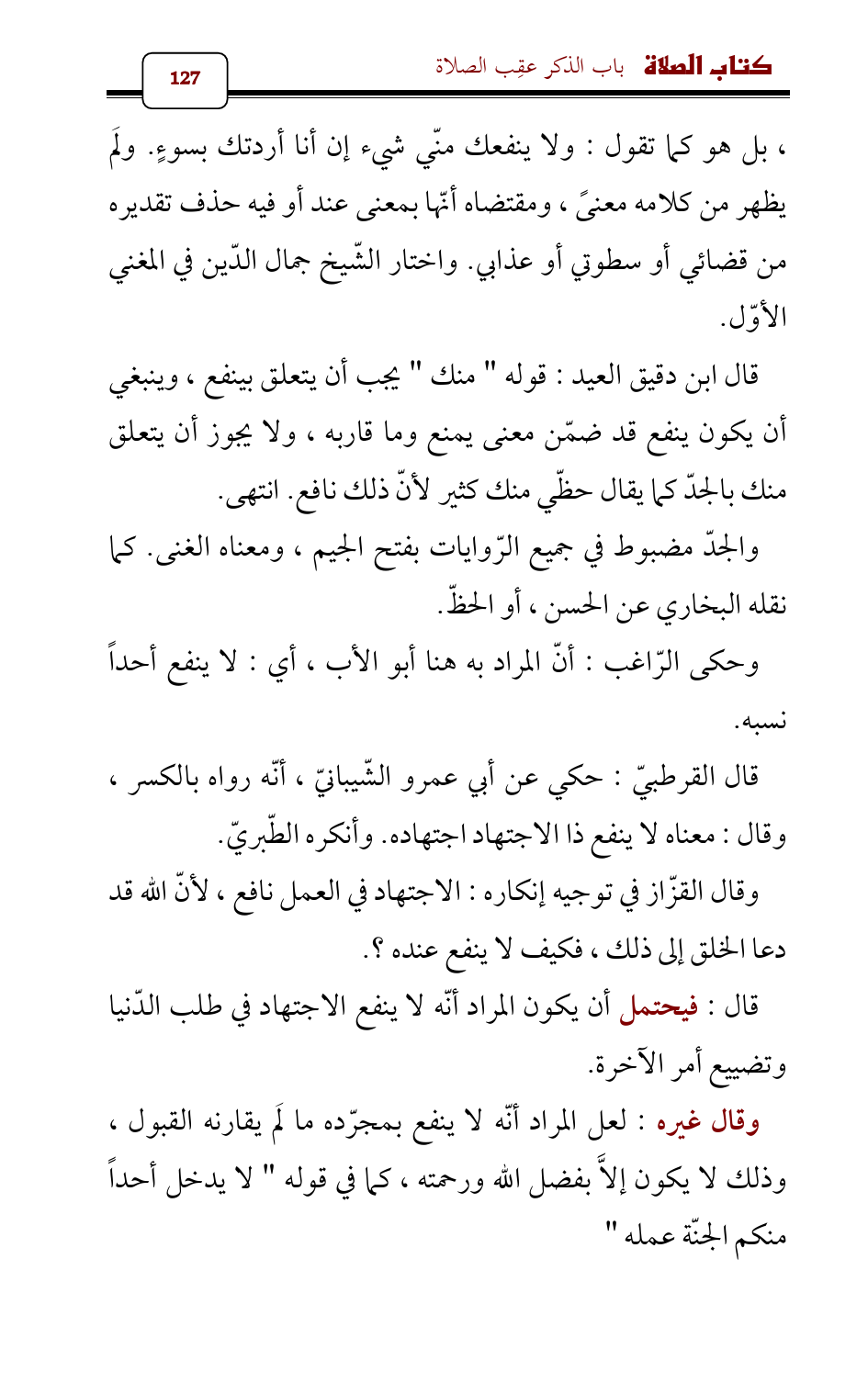 وقال غيره: لعل المراد أنّه لا ينفع بمجرّده ما لَم يقارنه القبول، وذلك لا يكون إلاَّ بفضل الله ورحمته، كما في قوله " لا يدخل أحداً منكم الجنّة عمله "