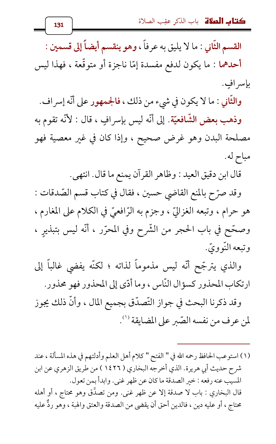 وقد صرّح بالمنع القاضي حسين , فقال في كتاب قسم الصّدقات: هو حرام، وتبعه الغزاليّ، وجزم به الرّافعيّ في الكلام على المغارم، وصحّح في باب الحجر من الشّرح وفي المحرّر , أنّه ليس بتبذيرٍ، وتبعه النّوويّ.