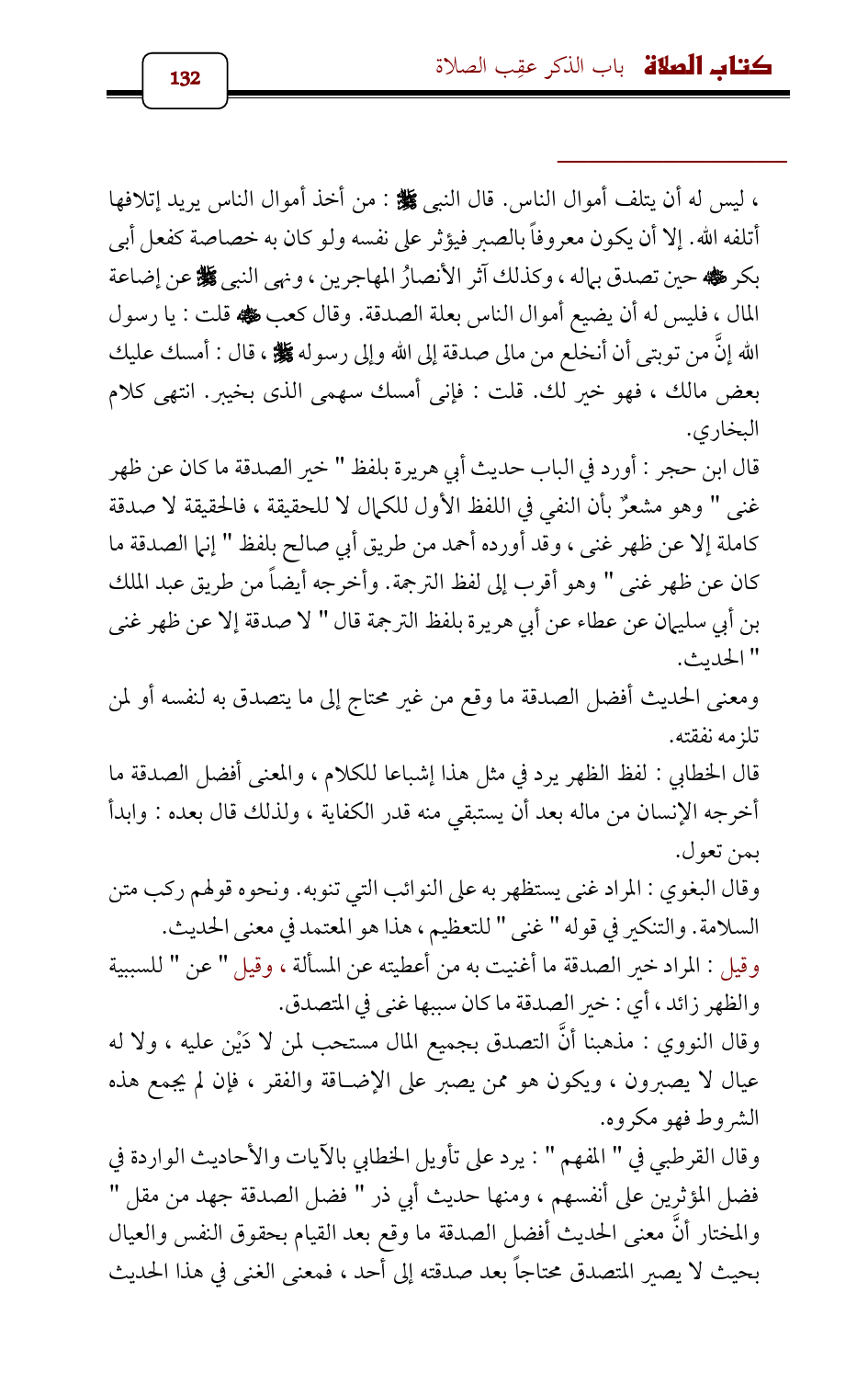 قال ابن حجر: أورد في الباب حديث أبي هريرة بلفظ " خير الصدقة ما كان عن ظهر غنى " وهو مشعرٌ بأن النفي في اللفظ الأول للكمال لا للحقيقة، فالحقيقة لا صدقة كاملة إلا عن ظهر غنى، وقد أورده أحمد من طريق أبي صالح بلفظ " إنما الصدقة ما كان عن ظهر غنى " وهو أقرب إلى لفظ الترجمة. وأخرجه أيضاً من طريق عبد الملك بن أبي سليمان عن عطاء عن أبي هريرة بلفظ الترجمة قال " لا صدقة إلا عن ظهر غنى " الحديث.
