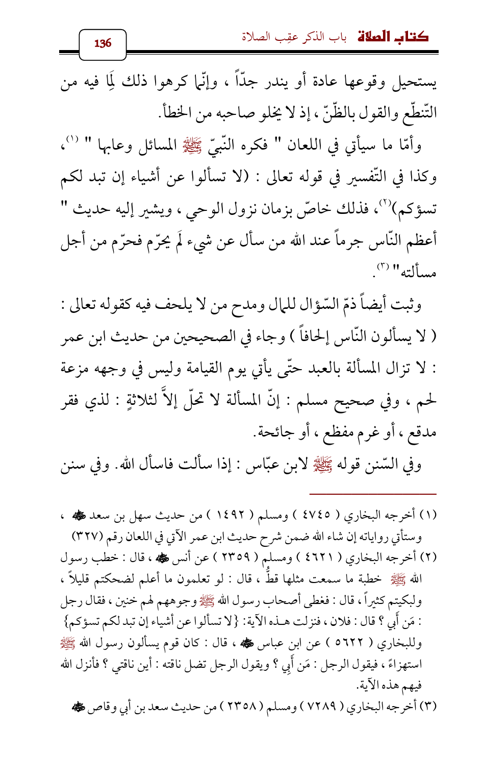 وأمّا ما سيأتي في اللعان " فكره النّبيّ - صلى الله عليه وسلم - المسائل وعابها " (¬1)، وكذا في التّفسير في قوله تعالى: (لا تسألوا عن أشياء إن تبد لكم تسؤكم) (¬2) , فذلك خاصّ بزمان نزول الوحي، ويشير إليه حديث " أعظم النّاس جرماً عند الله من سأل عن شيء لَم يحرّم فحرّم من أجل مسألته " (¬3).