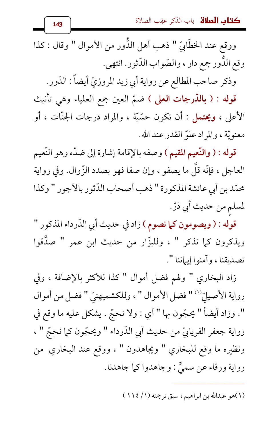 قوله: (والنّعيم المقيم) وصفه بالإقامة إشارة إلى ضدّه وهو النّعيم العاجل، فإنّه قلَّ ما يصفو، وإن صفا فهو بصدد الزّوال. وفي رواية محمّد بن أبي عائشة المذكورة " ذهب أصحاب الدّثور بالأجور " وكذا لمسلمٍ من حديث أبي ذرّ.