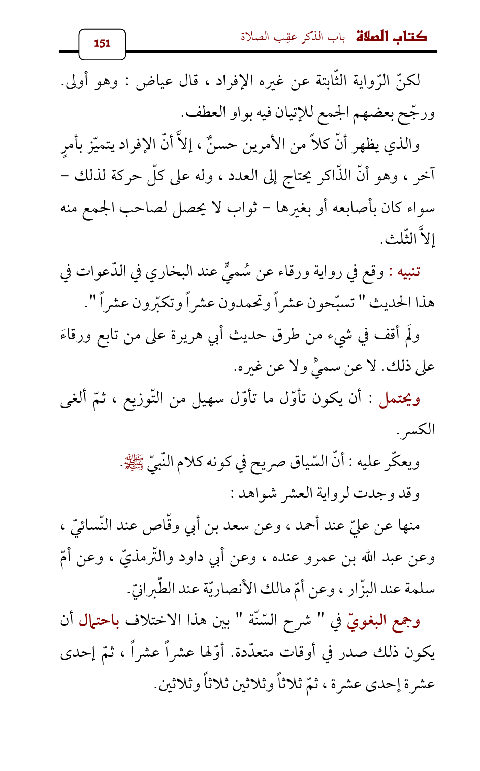 وجمع البغويّ في " شرح السّنّة " بين هذا الاختلاف باحتمال أن يكون ذلك صدر في أوقات متعدّدة. أوّلها عشراً عشراً , ثمّ إحدى عشرة إحدى عشرة , ثمّ ثلاثاً وثلاثين ثلاثاً وثلاثين.