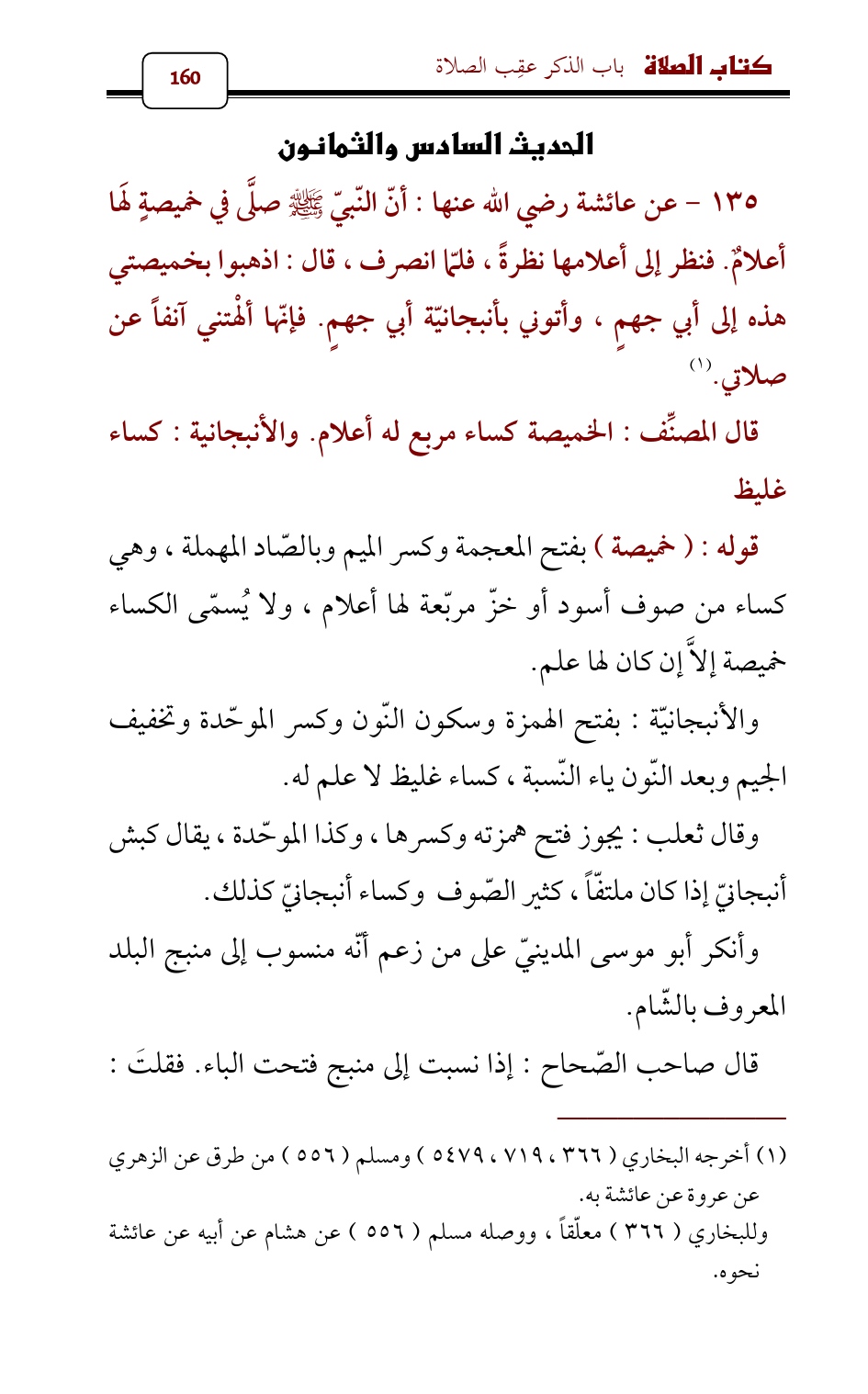 135 - عن عائشة رضي الله عنها: أنّ النّبيّ - صلى الله عليه وسلم - صلَّى في خميصةٍ لَها أعلامٌ. فنظر إلى أعلامها نظرةً , فلمّا انصرف , قال: اذهبوا بخميصتي هذه إلى أبي جهمٍ , وأتوني بأنبجانيّة أبي جهمٍ. فإنّها ألْهتني آنفاً عن صلاتي. (¬1)