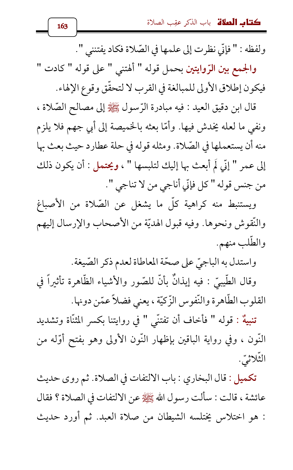 ولفظه: " فإنّي نظرت إلى علمها في الصّلاة فكاد يفتنني ".